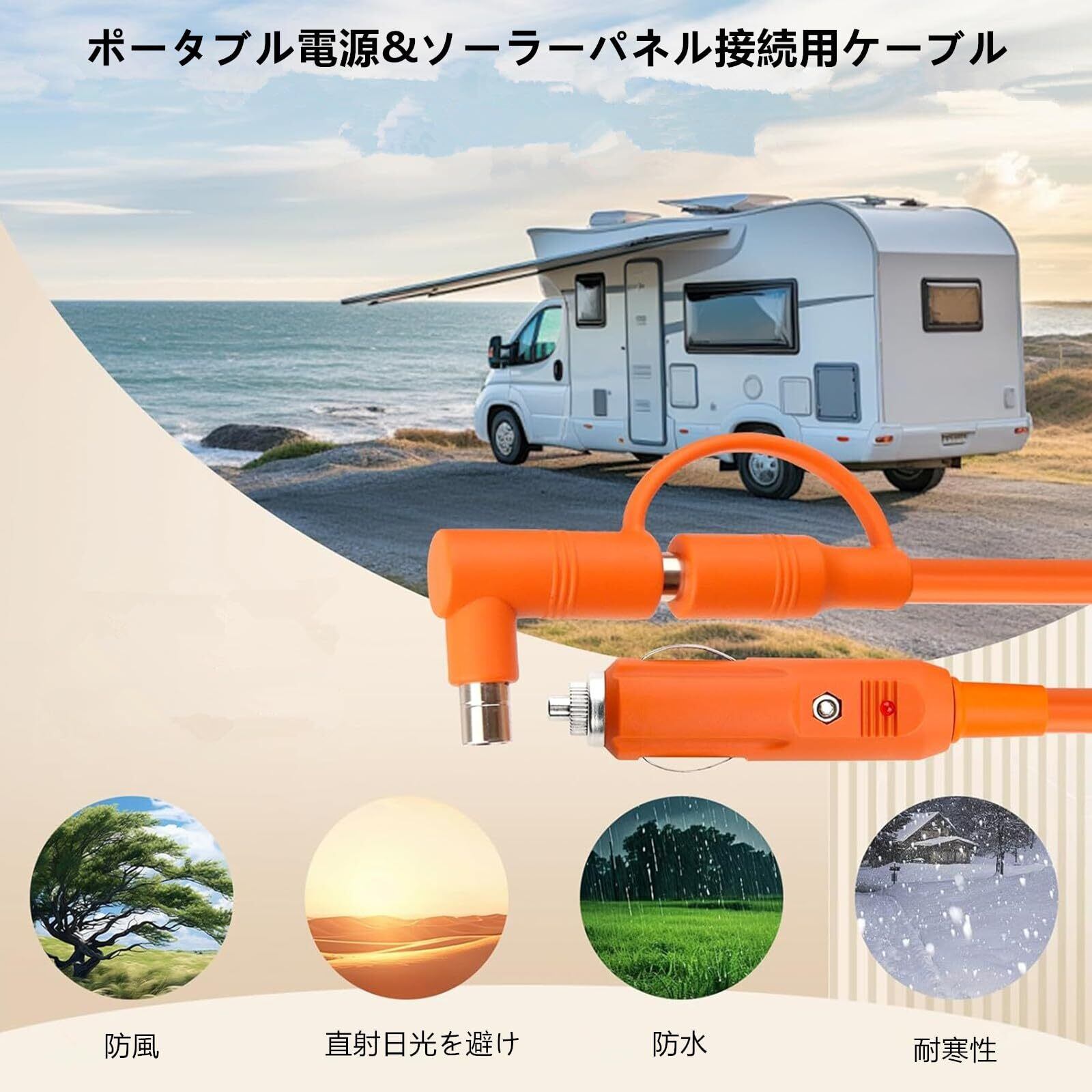 【仕様】規格:14AWG、長さ:1M、出力電圧: 12V/24V 許容電流:15A。防水レベルはIP67に達します。水や粉塵などがソーラー充電ケーブル内部に侵入しないことを確保できます