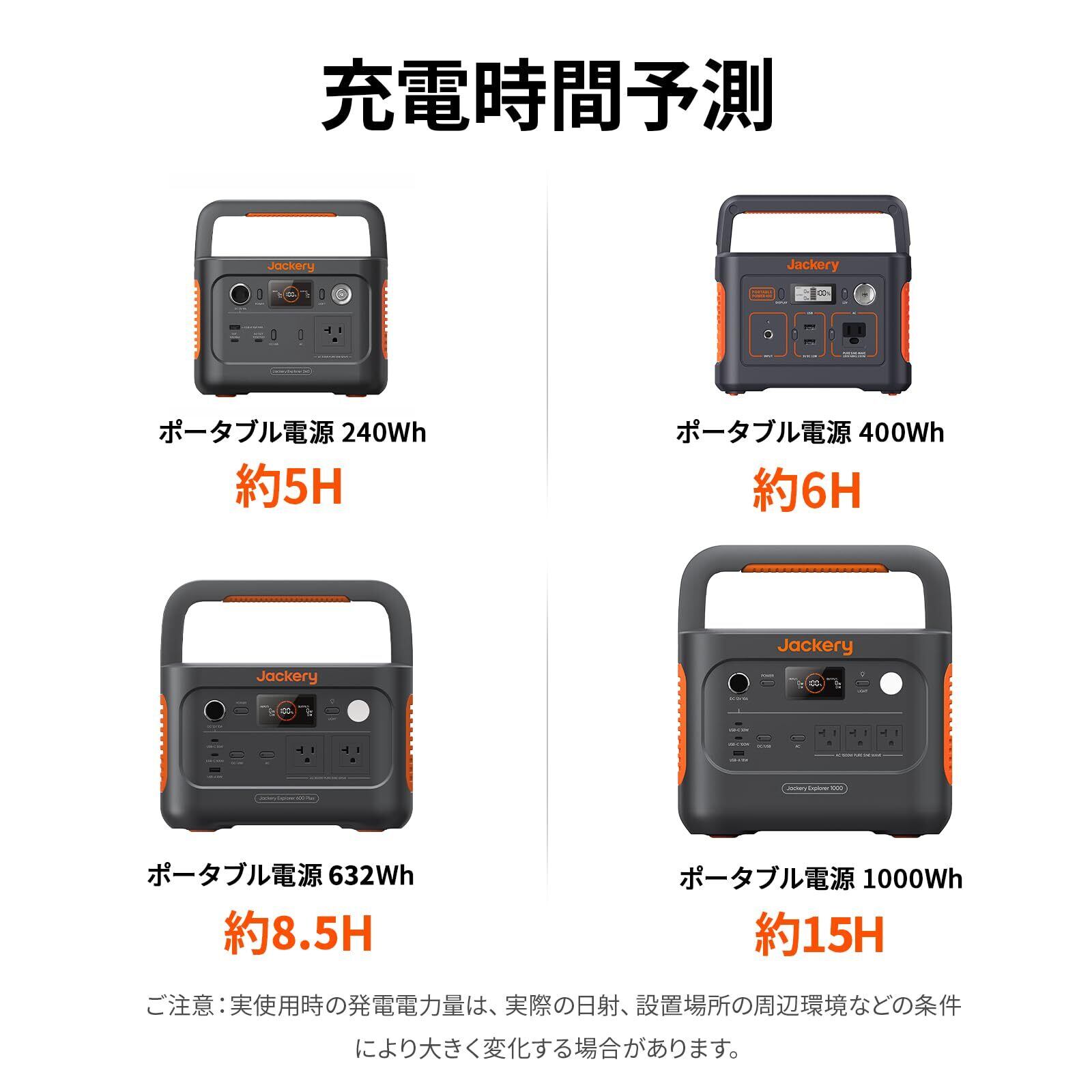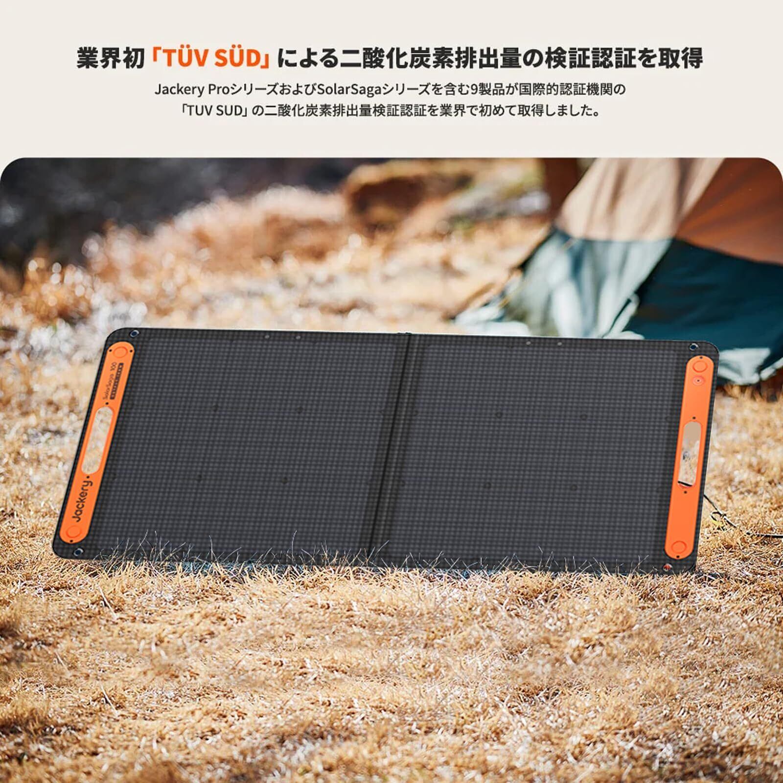 【ご注意】①Jackery SolarSaga 100使用時の発電電力量は、実際の日射、設置場所の周辺環境などの条件により大きく変化する場合があります。また、予告なく細かな製品仕様変更及び改善する可能性がございますので、予めご了承ください。②ポータブル電源1000は同型番のSolarSagaのみ並列接続可能です。