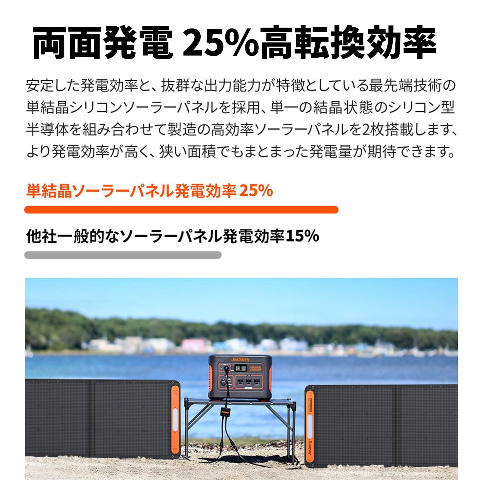 【米国の太陽電池技術】Jackeryソーラーパネルは優れた性能を備えた効率的な住宅用ソーラーパネルで作られており、システムの寿命にわたってより多くのエネルギーを生成し、性能を向上させるだけでなく、耐久性が最大の特徴です。同じサイズの高出力、切断線のない滑らかな表面、より安定した発電性能、高効率光電変換や曲げられるという機能性を併せ持ったことはJackeryソーラーパネルの強みです。同じ面積で一般的な太陽電池より50%高い電力を提供することができます。