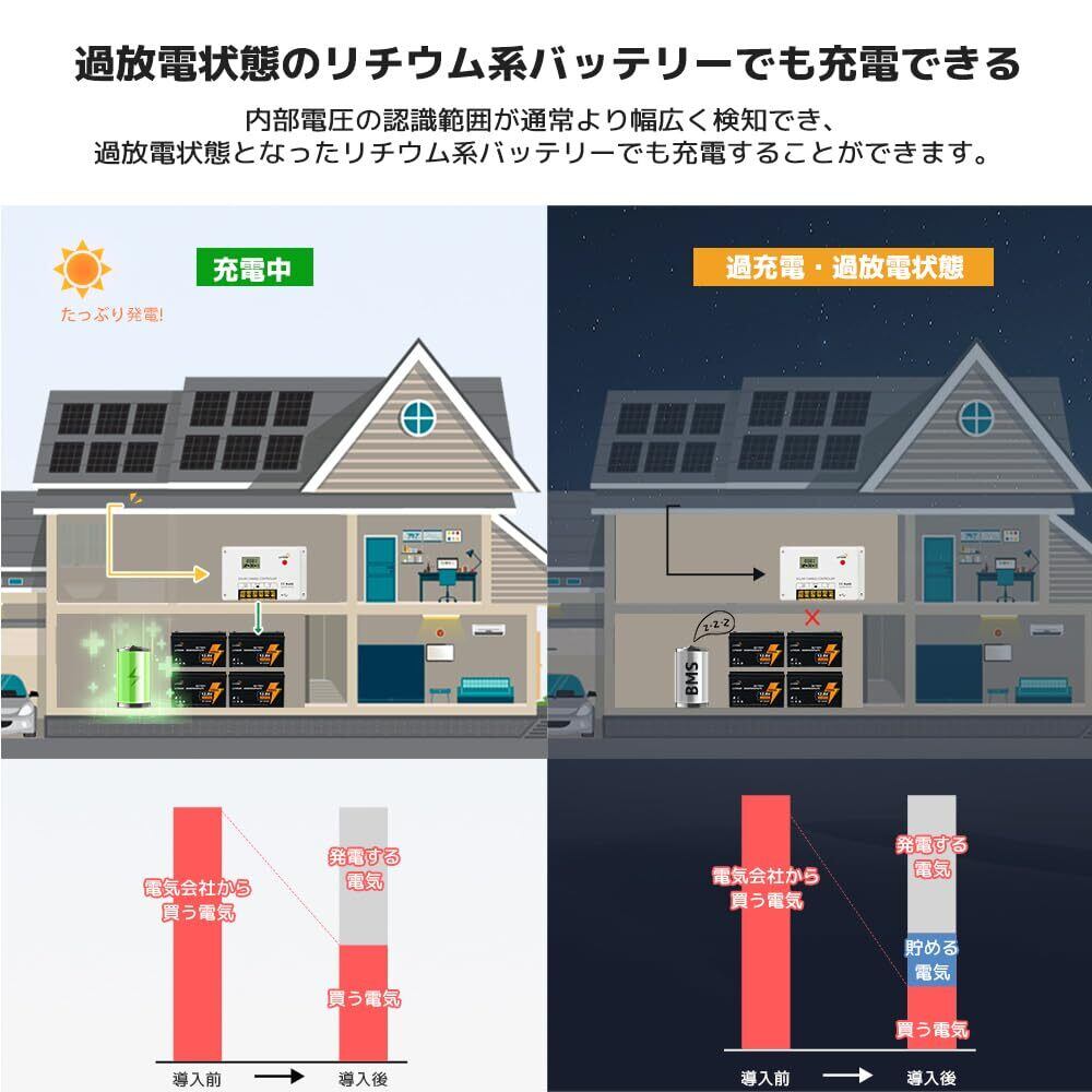 【安全の保護機能】1.内蔵の逆接続保護、オープン回路保護、高温保護、過電流/短絡保護(設定可能) / 2.多段階PWM充電管理が完備され、断続型充電に切り替え可能。 / 3.ダブルMOS防倒灌回路により、極めて低い発熱量を実現。