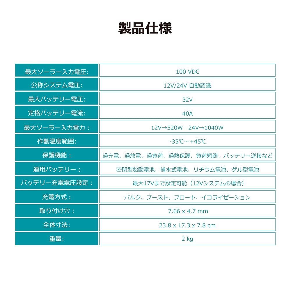 【電圧自動識別&多様なバッテリータイプ対応】 12Vと24Vシステムを自動的に認識します。最大入力電力は12Vシステムで520W、24Vシステムで1040Wの仕様となります。(最大充電電流は40A、最大入力電圧は100VDC)ゲル電池とを含め、様々なタイプのバッテリーに充電できます。