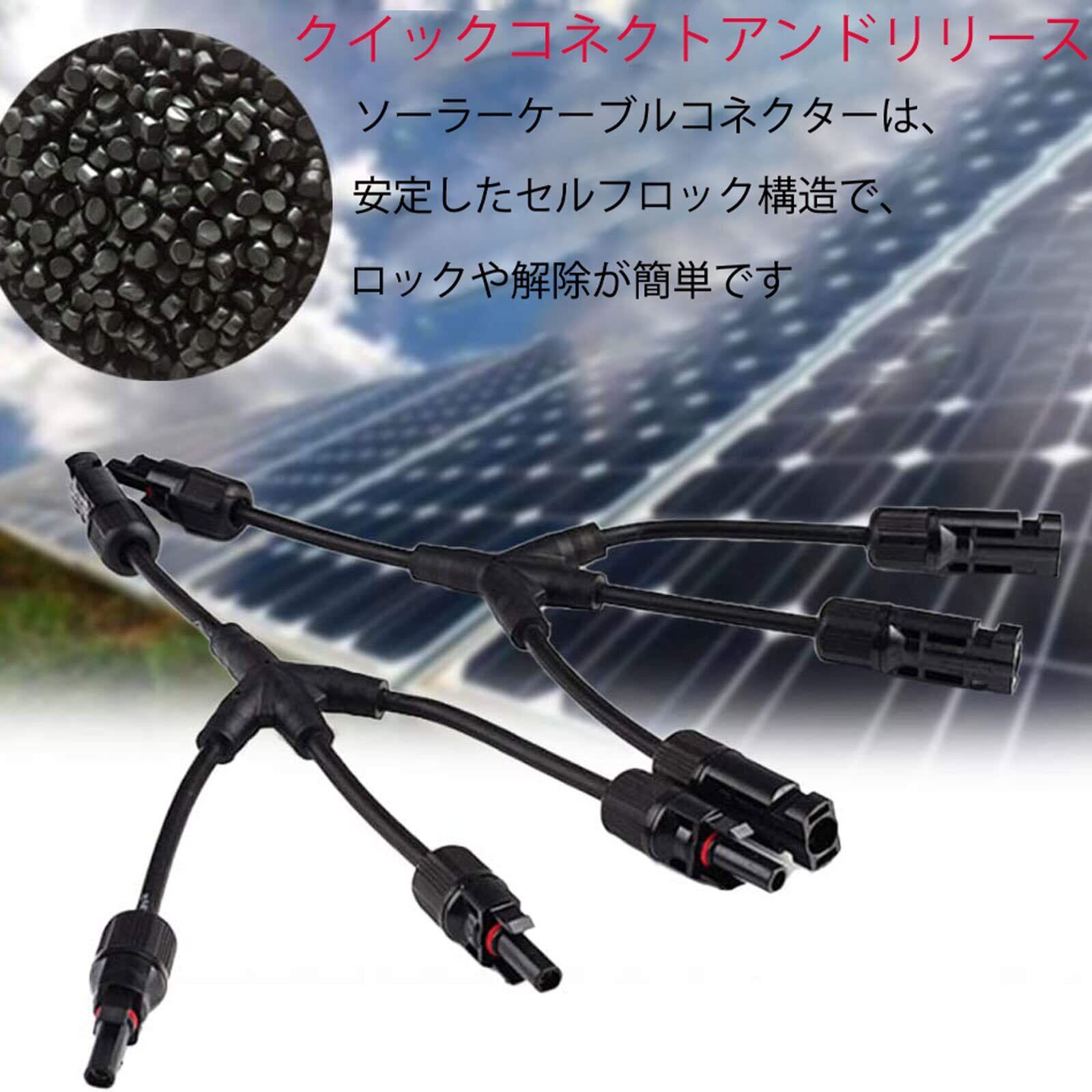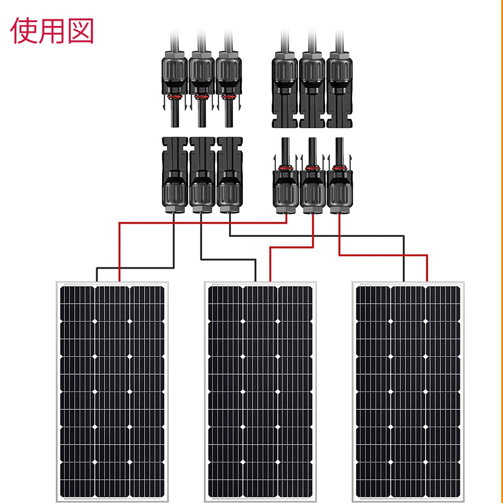 【ソーラーパネルブランチコネクター】1メスから2オス(M/FFF)と1オスから2メス(F/MMM)の接続が可能です。このコネクターは2つのソーラーパネルを並列接続することができます。すべてのMC4ソーラーコネクタと互換性があり、取り付けが簡単で、耐久性があり、再使用可能です。