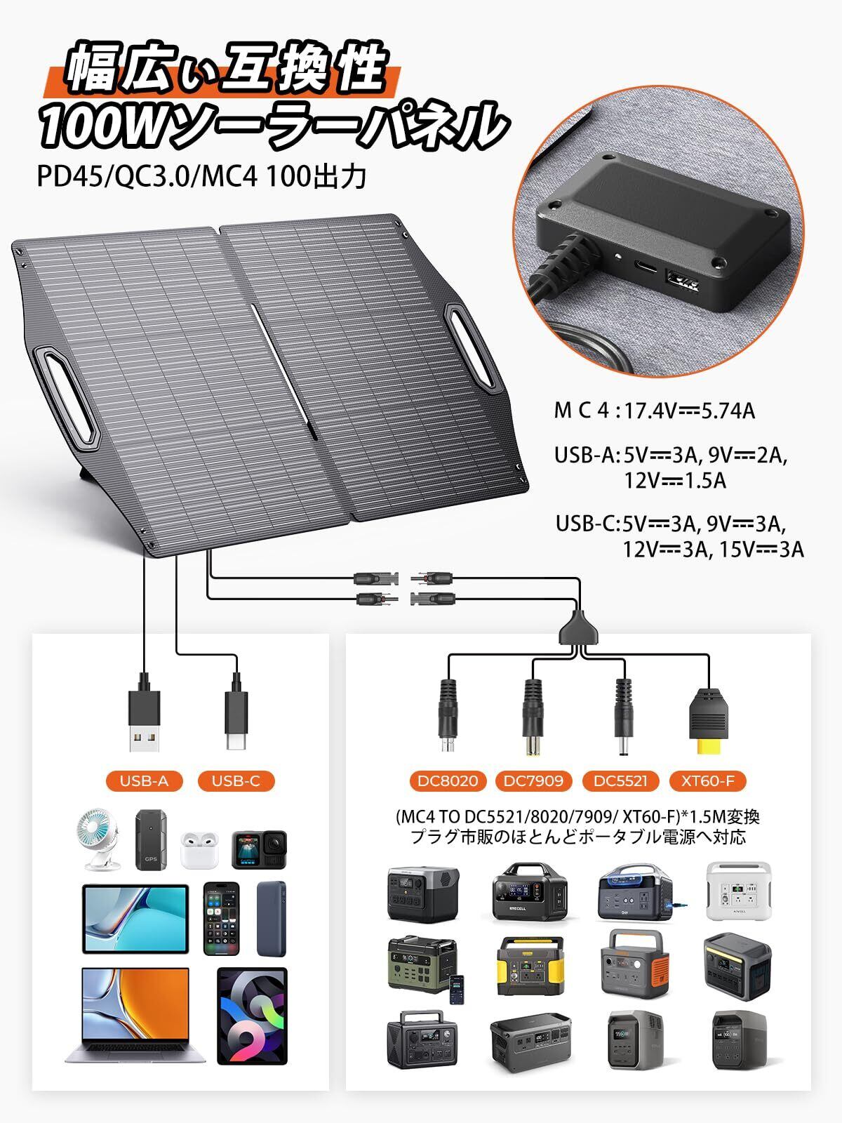 【MC4 100W&PD45W高出力&QC3.0で急速充電】MC41to DC5521・DC8020・DC7909・XT60-F変換ケーブルを搭載し、 ソーラーパネルは市販の大部分のポータブル電源に対応できます。そして、USB-A*1(QC3.0出力:5V3A-9V2A-12V1.5A)USB-C *1(PD45W高出力:5V3A-9V3A-12V3A-15V3A)のポートを搭載しており、スマホ、タブレット、PC、モバイルバッテリー、ポータブル電源など幅広い機器の充電に対応できます。同時充電可能で地震などの災害の時は役に立ちます。