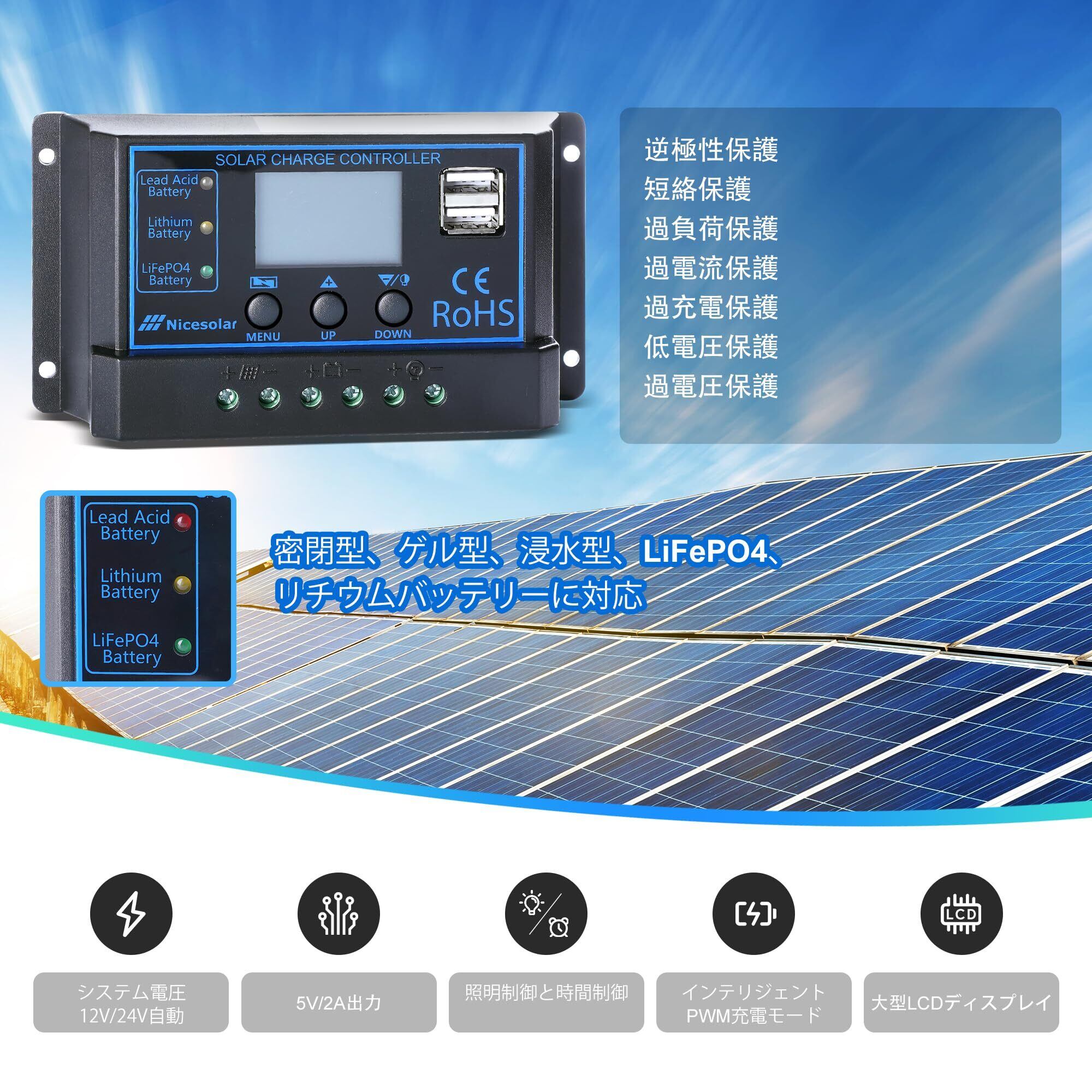 【様々な種類のバッテリーに対応】20Aソーラーチャージコントローラー 自動車、ボート、RV車、海洋住居などで使用される密閉型、ゲル型、水没型、LiFePO4、リチウムバッテリーに対応。