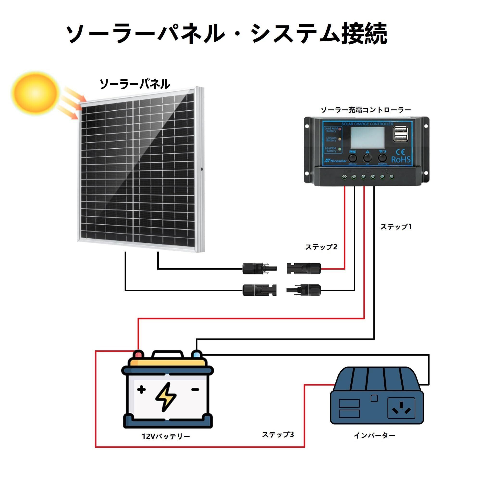 【接続順序】 1.まず、チャージコントローラーとバッテリーを接続し、バッテリー電圧を確認します(24Vバッテリーはソーラーパネル2枚と直列に接続する必要があります) 2.ソーラーパネルとチャージコントローラーの接続を行います 3.最後にチャージコントローラーと負荷を接続します。