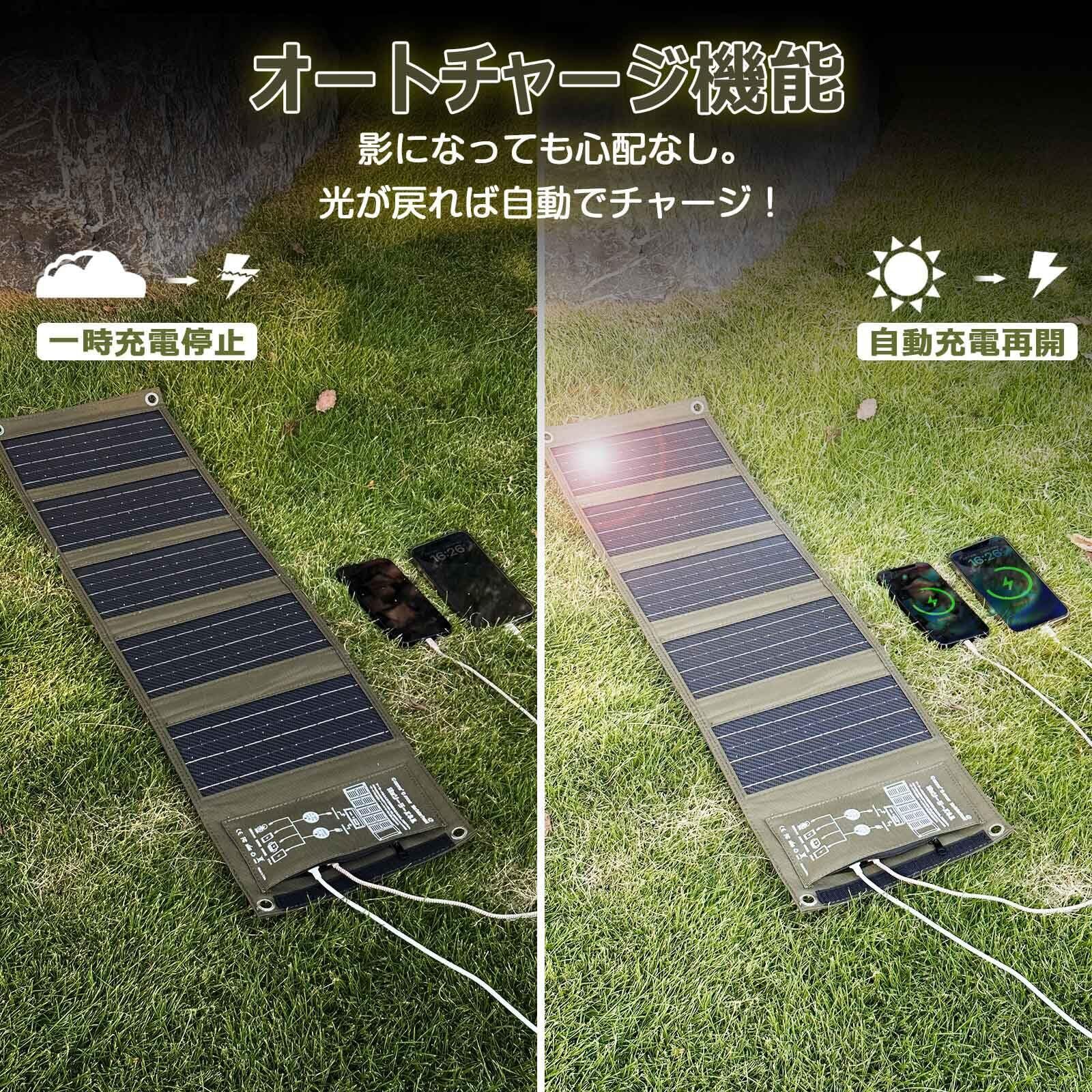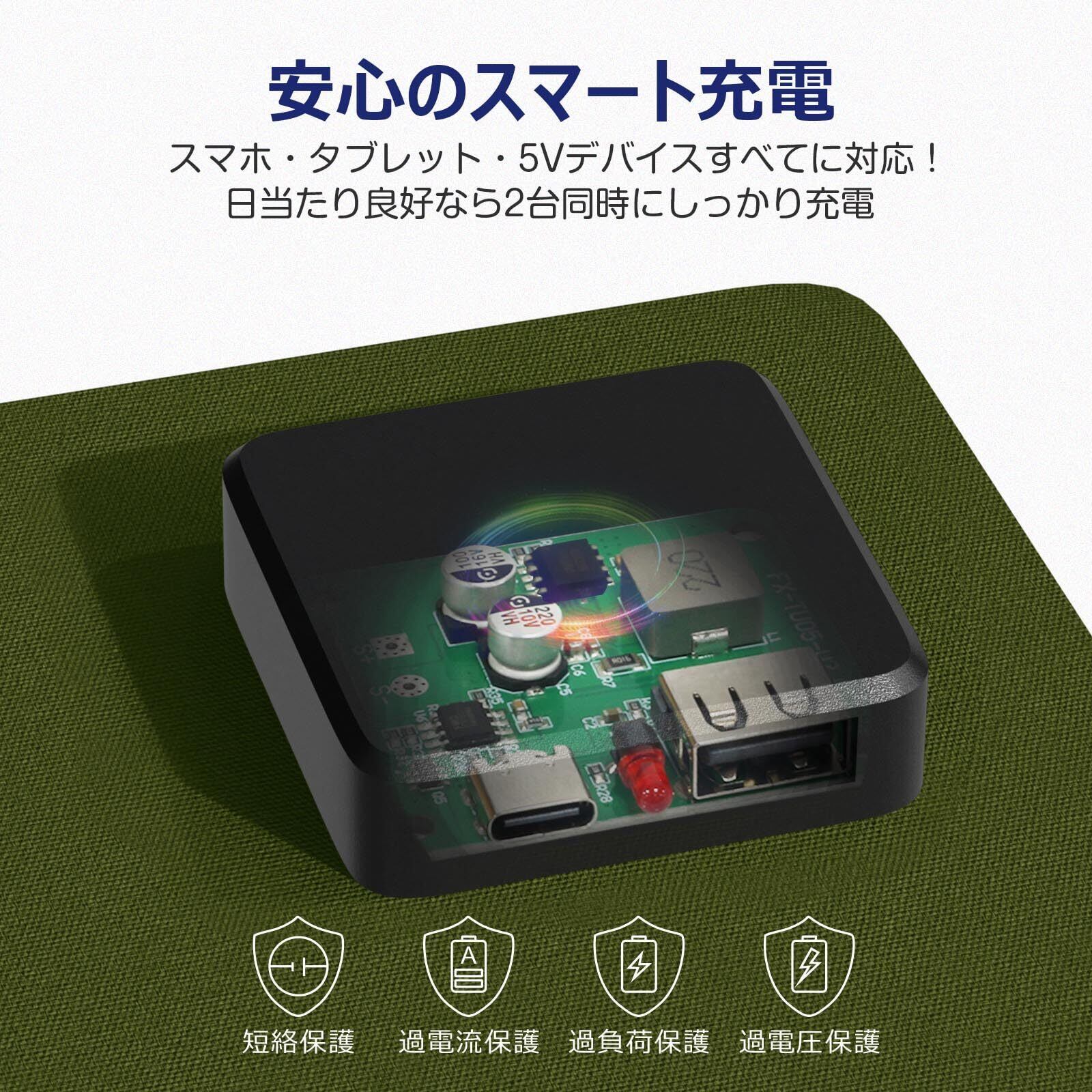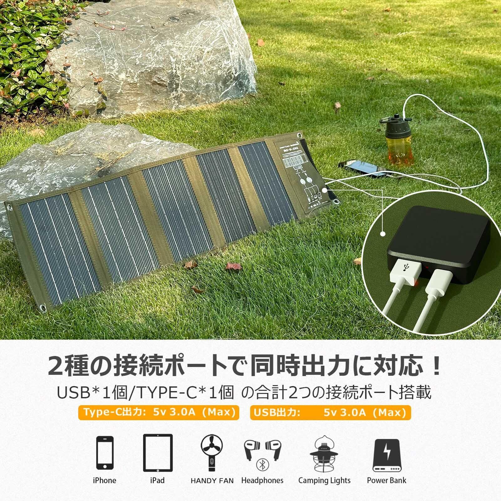 【多数充電口】TYPE-CとUSBのデュアル出力ポートを装備し、複数デバイスの同時充電に対応可能。太陽光 充電器としてスマートフォンやタブレットなど様々な機器に使用できます。