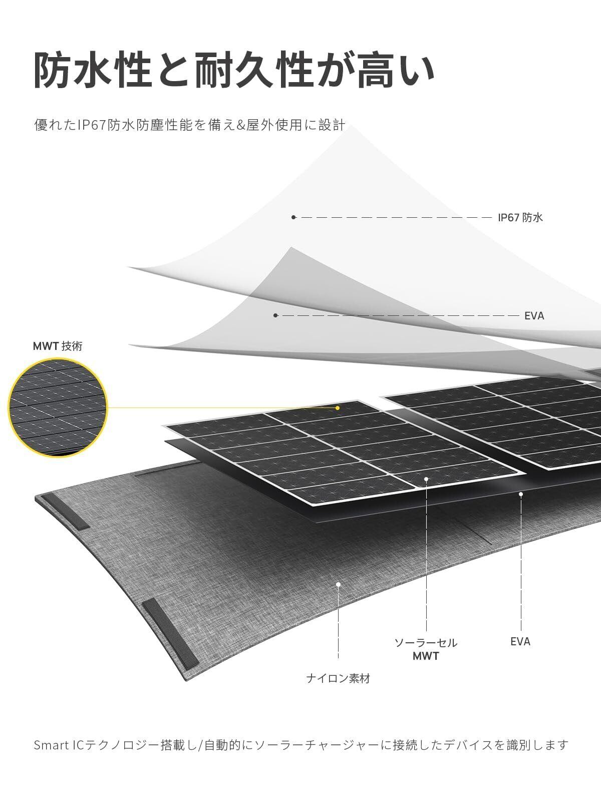 「IP65防水防塵」AFERIY 100W ソーラーパネルは、高い耐久性を備えた素材とIP65規格の防水防塵性能により、過酷な屋外環境での使用に最適化されています。さらに、FCC、RoHS、CEなどの国際規格認証を取得。過充電保護、短絡保護、過電流保護といった多重的な安全機能を搭載し、高い安全性を確保しています。
