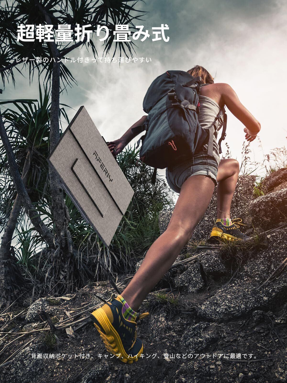 「折り畳み式・軽量コンパクト」AFERIY 折り畳み式 100W ソーラーパネルは、わずか約3.25kgの軽さ。使用時は約165cmの広さで効率的な発電を実現し、収納時は約47cmのコンパクトサイズに。ゴム製ハンドル付きで持ち運びも楽々です。さらに、ソーラーパネルの背面には収納ポケットを装備し、付属ケーブルなどの小物をまとめて収納可能。その軽量・コンパクト設計と利便性から、アウトドア、キャンプ、ハイキング、登山など、さまざまな野外シーンでの活躍に最適です。