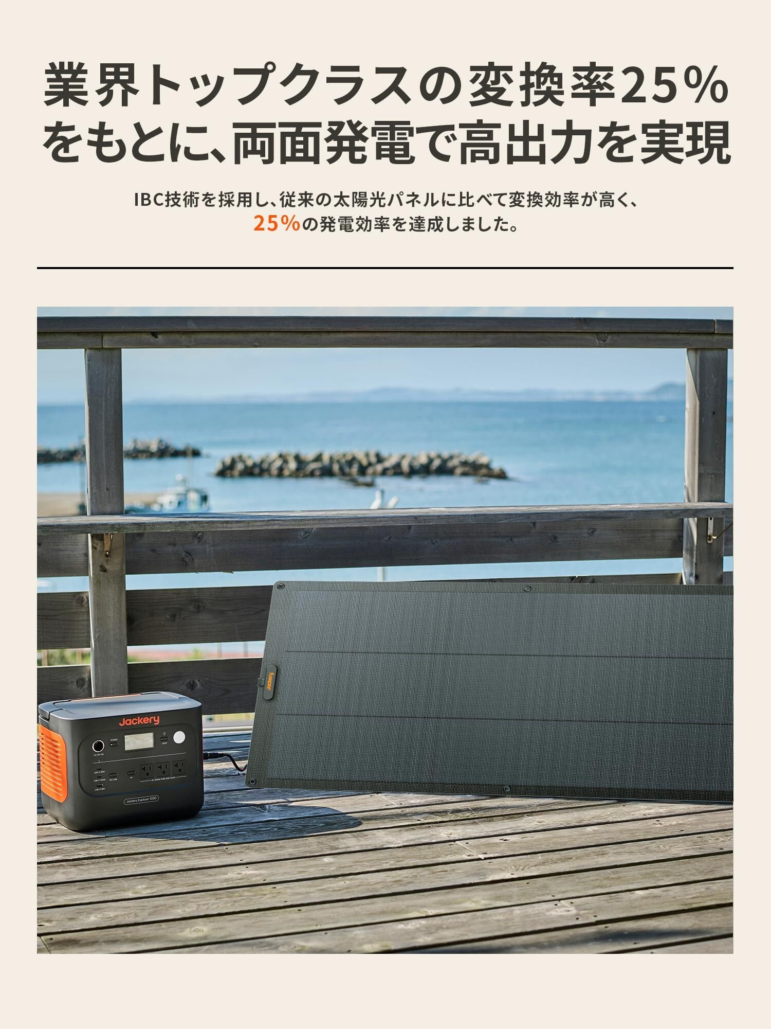 【ご注意】①Jackery SolarSaga 100使用時の発電電力量は、実際の日射、設置場所の周辺環境などの条件により大きく変化する場合があります。また、予告なく細かな製品仕様変更及び改善する可能性がございますので、予めご了承ください。②ポータブル電源1000は同型番のSolarSagaのみ並列接続可能です。