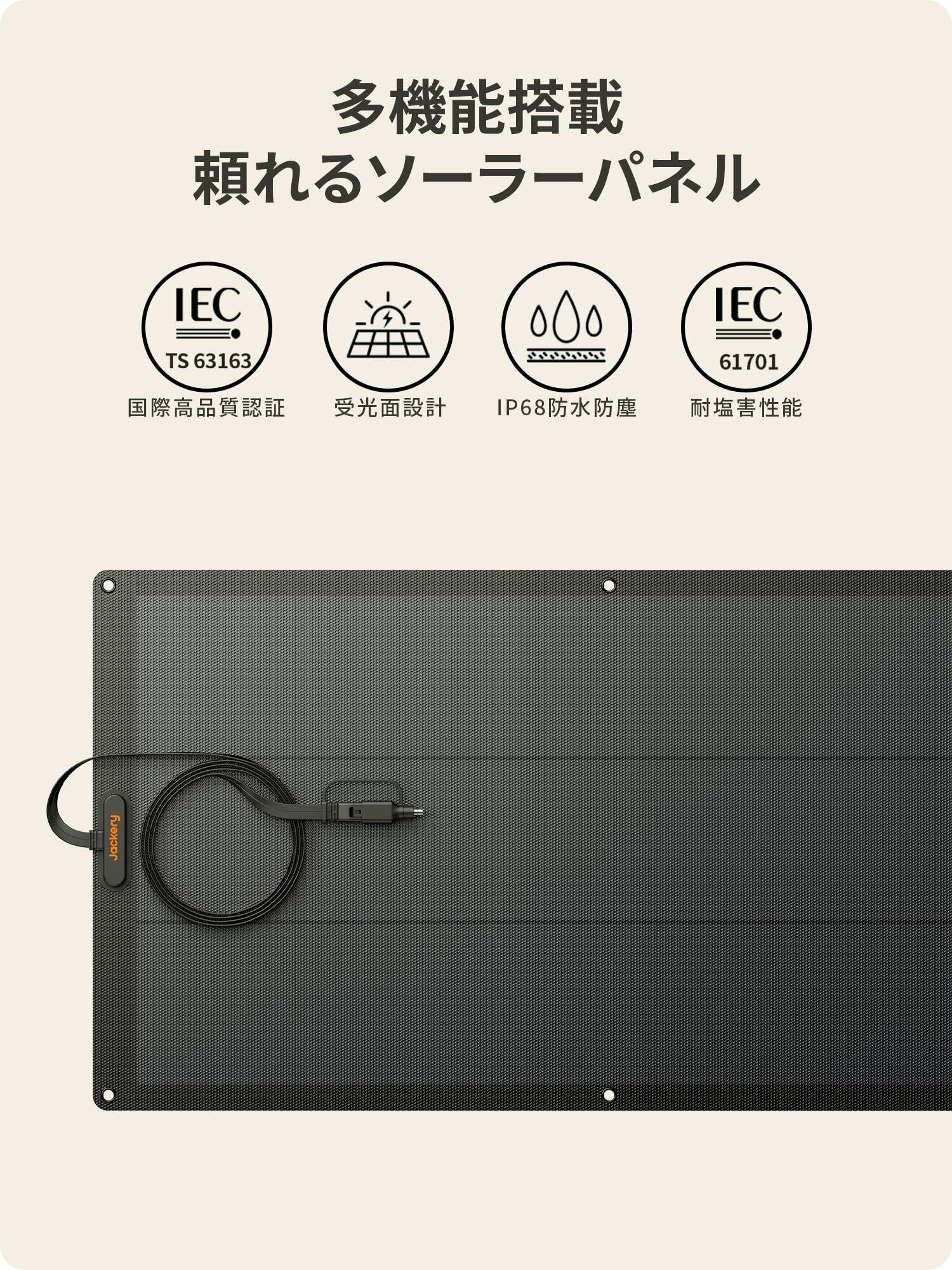 【ETFE素材採用】Jackeryソーラーパネルは特殊フッ素樹脂コーティングETFEを採用しております。他のフッ素樹脂に比べて塗膜厚が厚く、耐熱・耐食などにも長けており、耐久性などが求められる工業用部品などにも用いられます。ETFE素材採用したJackeryソーラーパネルは光透過率が高く、信頼できる、高温を恐れず、燃焼や爆発の危険がありません。防水機能はIP65防水等級となっており、通常の雨や風にはIP65規格(電気機械器具の保護等級)に適合していますが、近年のゲリラ豪雨や台風などには完全防水ではありませんので、耐えられません。 ※雨水や風の浸入の影響で故障の原因になります。