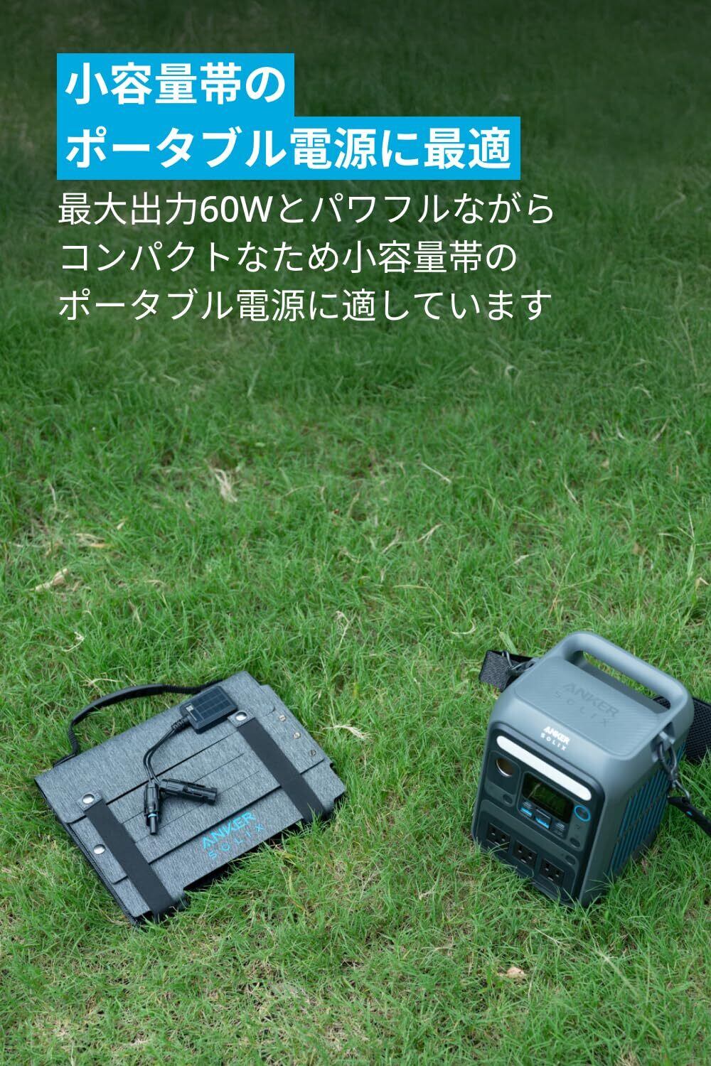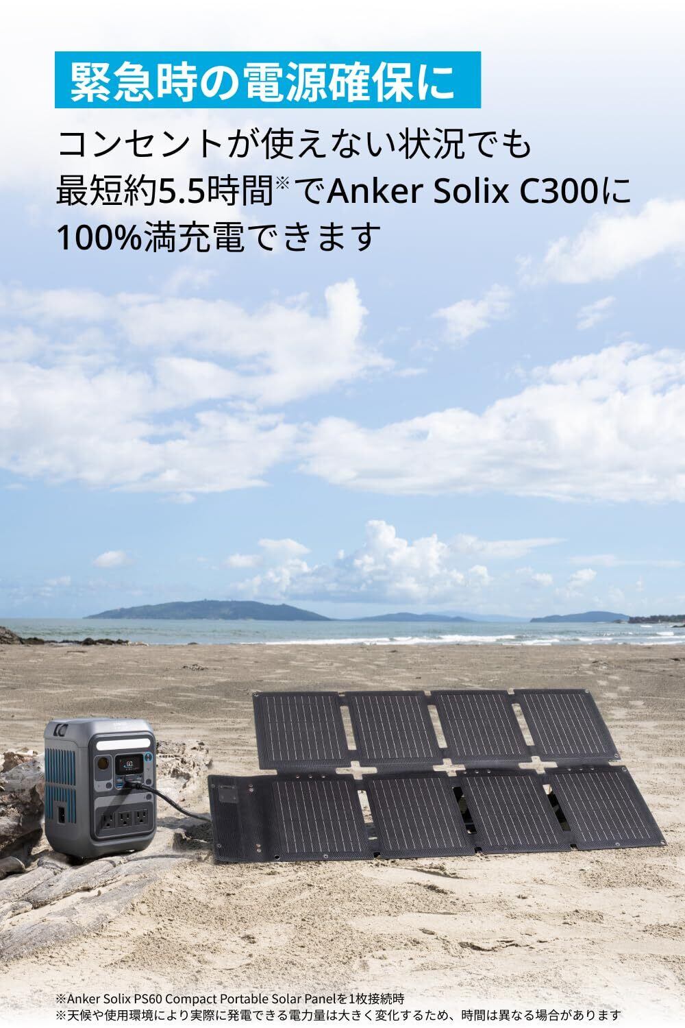 太陽光から最大60Wを発電:高効率な単結晶パネルを採用し、小型軽量のコンパクトサイズながら最大60Wの発電性能を備えます。本製品ではソーラーパネル1枚でAnker Solix C300 Portable Power Stationを最短5.5時間※で満充電が可能です。 ※天候や使用環境により実際に発電できる電力量は大きく変化するため、時間は異なる場合があります。