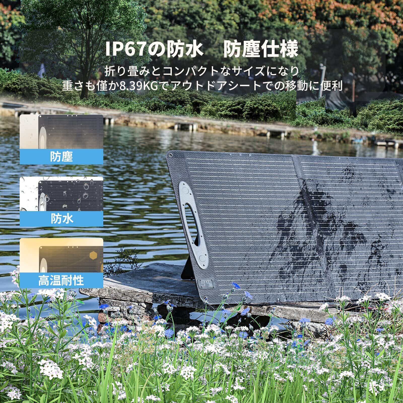【優れた耐久性】 ソーラーパネルは「ETFEラミネート」によって長寿命化に加え、耐久性を高めました。また、IP67の防水規格に準拠しているため、雨などの厳しい天候にも耐えることができます(接続部分は防水ではないため、ご注意ください)