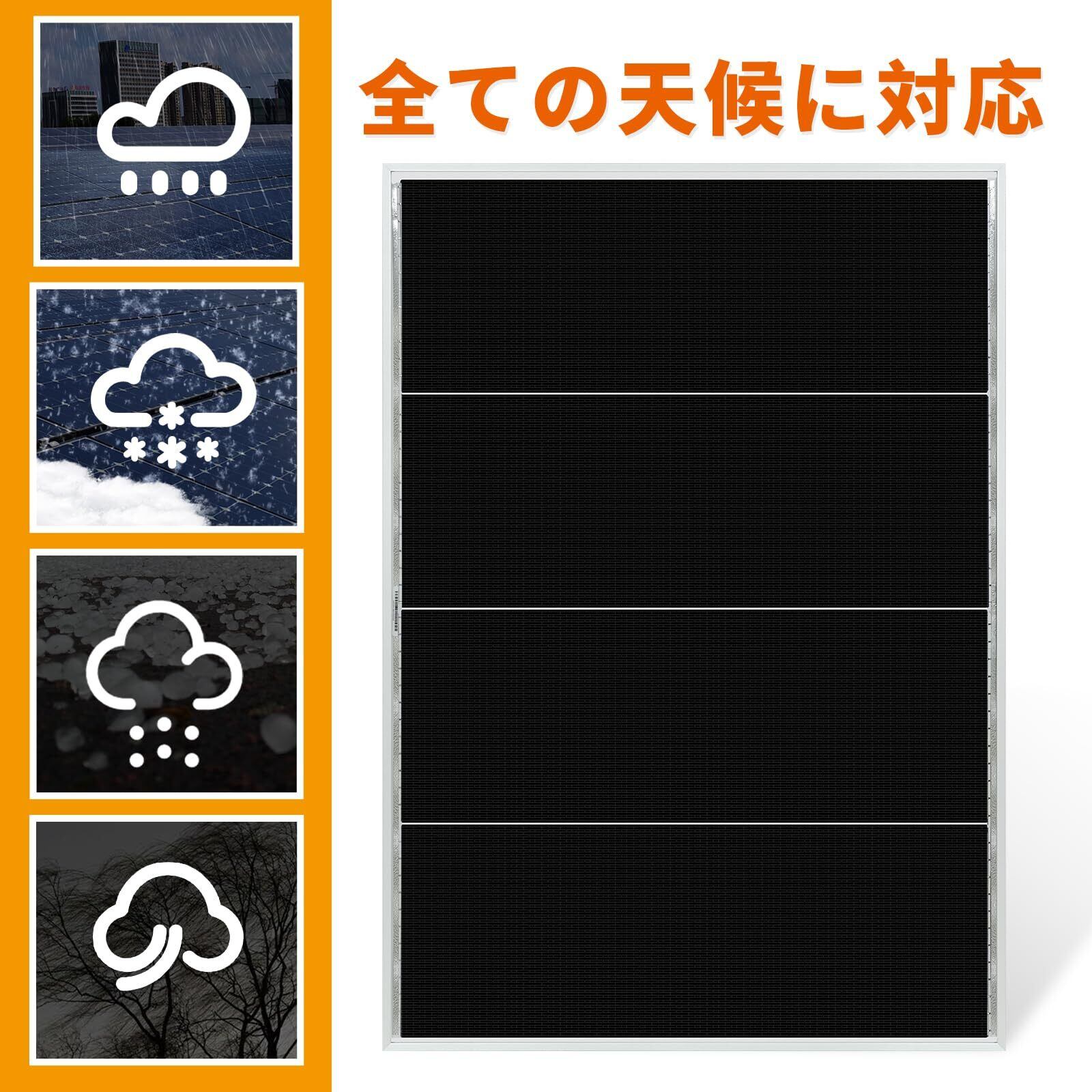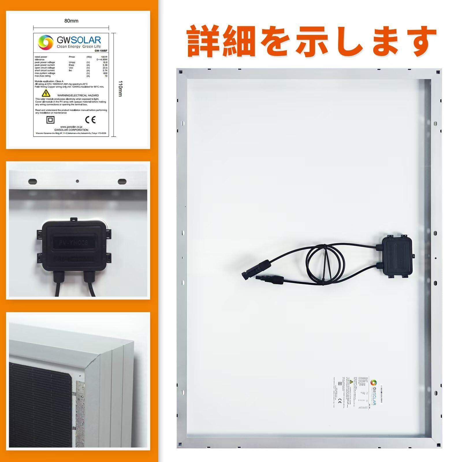 【仕様】型番:GW-100BF 最大出力:100W ・ 最大出力動作電圧:18.8V ・最大出力動作電流 5.36A ・開放電圧23.5V ・短絡電流: 5.74 A ・外形寸法:875×610×30mm ・質量:約5.4kg/枚 ・ケーブル長さ:約50cm(MC4コネクタ付 正極:凸型 負極:凹型)