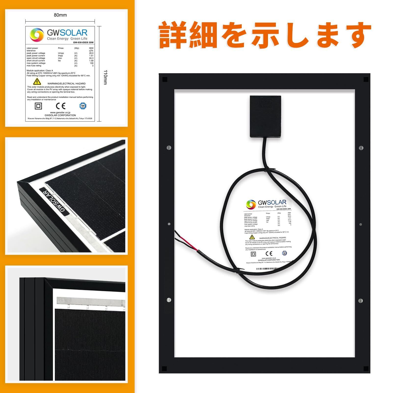 【仕様1】出力:30W ・セル種類:単結晶 ・最大動作電圧(Vmp):20.0V / ・最大動作電流(Imp):1.51A ・開放電圧(Voc):24.3V / 短絡電流(Isc):1.59A 型番:GW-030-E0D5【仕様2】取付け穴6個、外形寸法:490x344x25(mm) 接続ケーブル長さ:1m ・重量:約2.02kg ・材質:強化ガラス、ブラック アルミフレーム枠