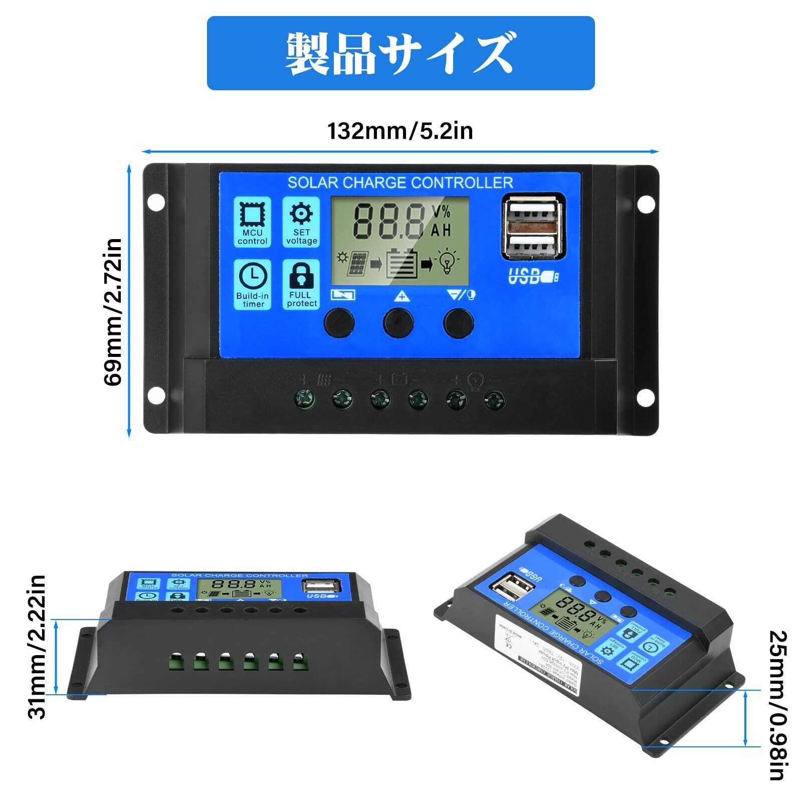 [フレキシブル・バッテリー・マネジメント]ソーラー・コントローラーは、フロート電圧(14.4V)、放電カットオフ電圧(10.7V)、回復電圧(12.6V)のカスタマイズ調整に対応している。バッテリーの健全性を的確に保護するよう設計されており、実用性と航続距離の両方のためにデュアルUSB端子(5V/1A)を装備している。