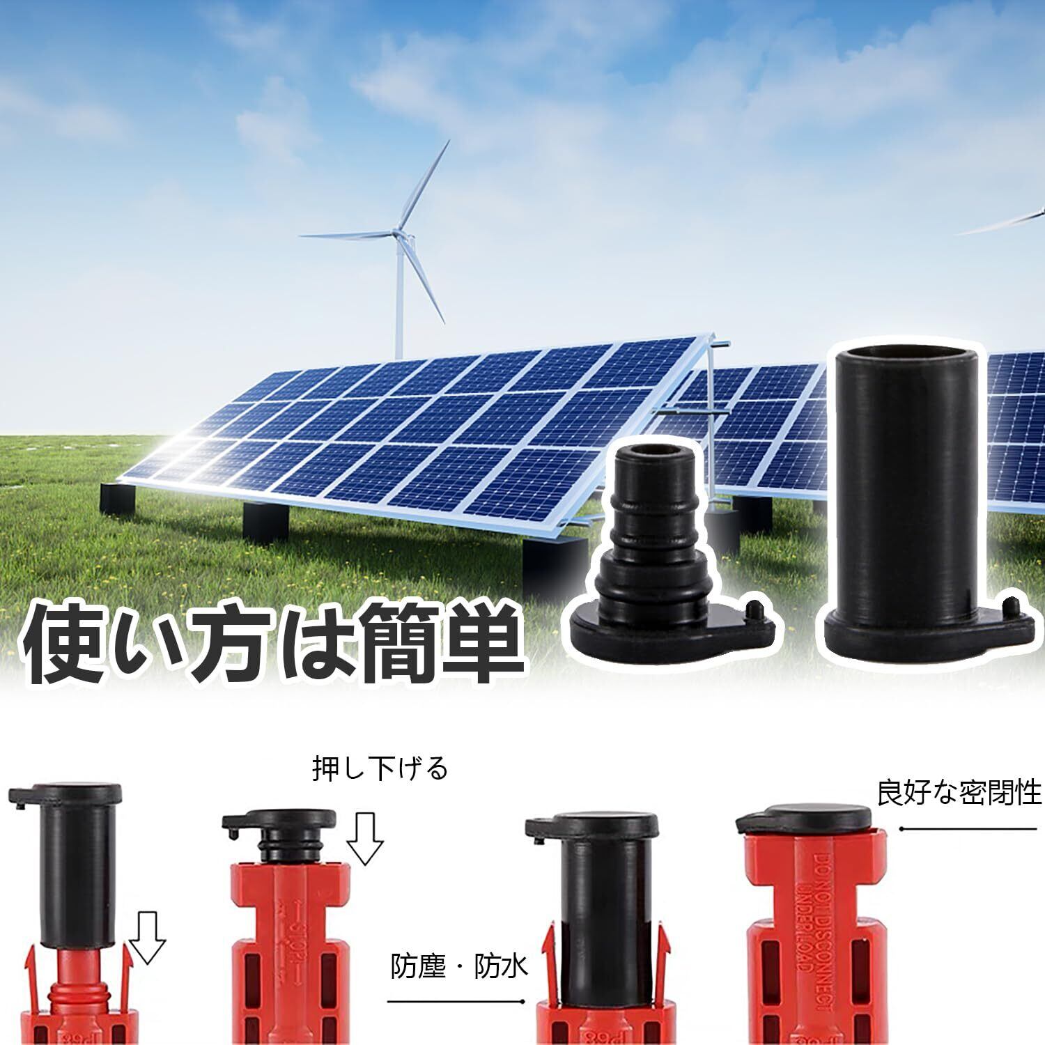 【使用方法は簡単】 このソーラーパネルコネクタキャップの取り付けまたは取り外しは、ひねるだけで簡単です。キャップは安定しており、コネクタの性能や安定性に影響を与えません。毎回手間のかからない取り付けと取り外しをお楽しみください。