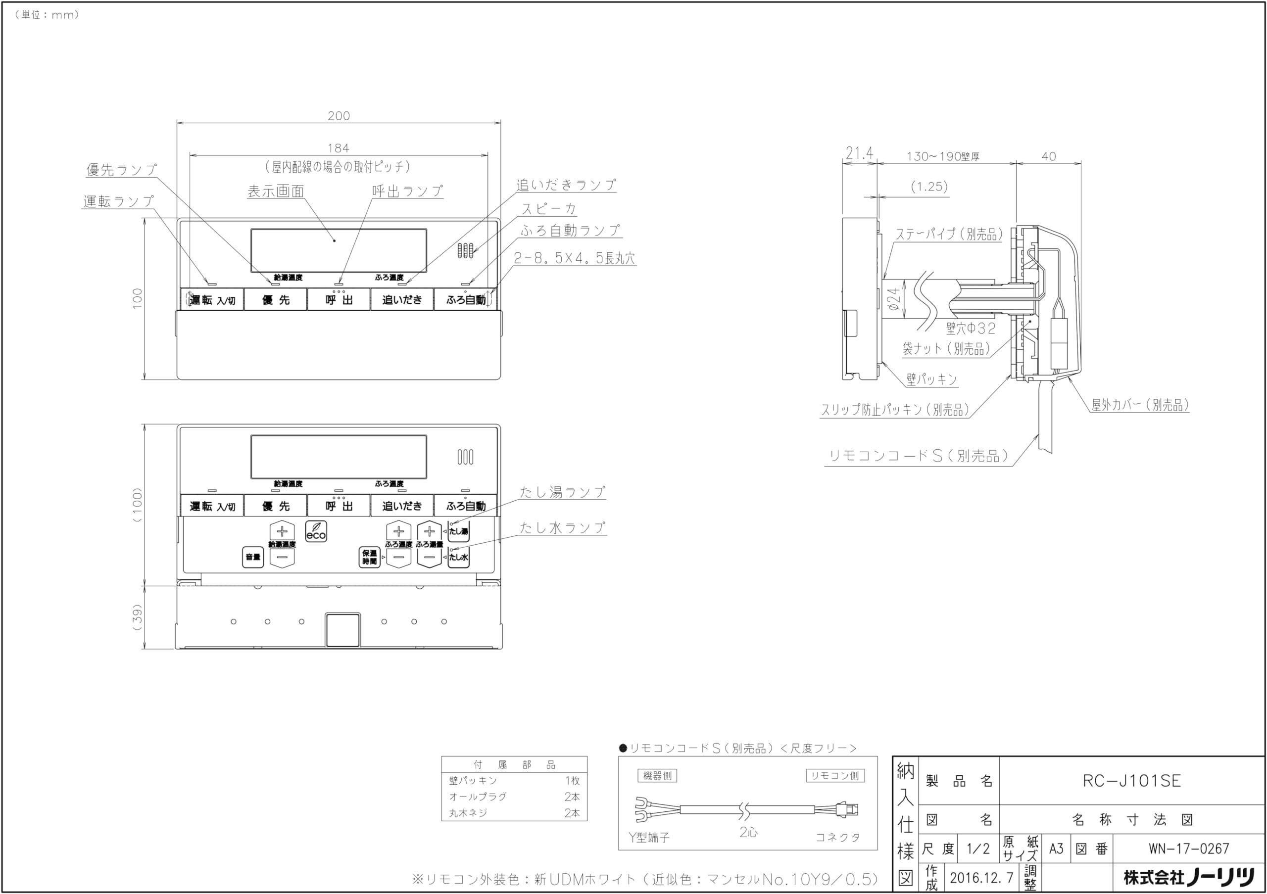 ノーリツ ガス給湯器用 浴室リモコン RC-J101SE