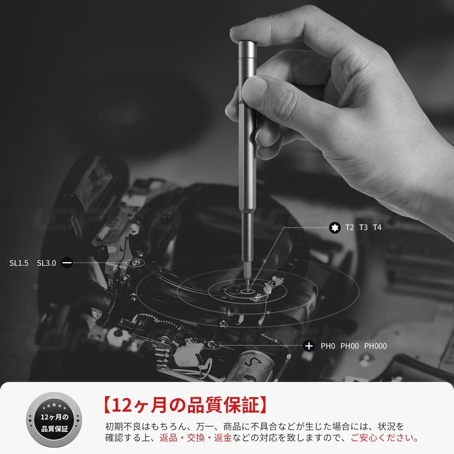【ビットの種類が豊富】24種類のビットで一般エレクトロニクスの分解・修理に対応可能です。ドライバー トルクス *:T2、T3、T4、TR5 ( T5 )、TR6 (T6H)、TR8 (T8H)、TR9 (T9H)、TR10 (T10H); Y型 ドライバー トライウィング:Y0.6 mm ( y000 ), Y1.5 mm ( y00 ), Y2.5 mm ( y0 ); 星形 5溝:P2 (0.8mm)、P5 (1.2mm); マイナス -:SL1.5mm、SL3.0mm; プラス +:PH000 (#000)、PH00 (#00)、PH0 (#0)、PH1 (#1)、PH2 (#2); 六角:H1.5、H2.0; U型:U2.6; 三角 △:2.3。ビット長さ:4*28mm (6角対辺4mm)。ドライバー セットは、深さ 18 mm 以上、直径 5 mm 未満の深い穴のネジを取り外すのには適していません。 取り外したいネジのサイズをよく確認してください