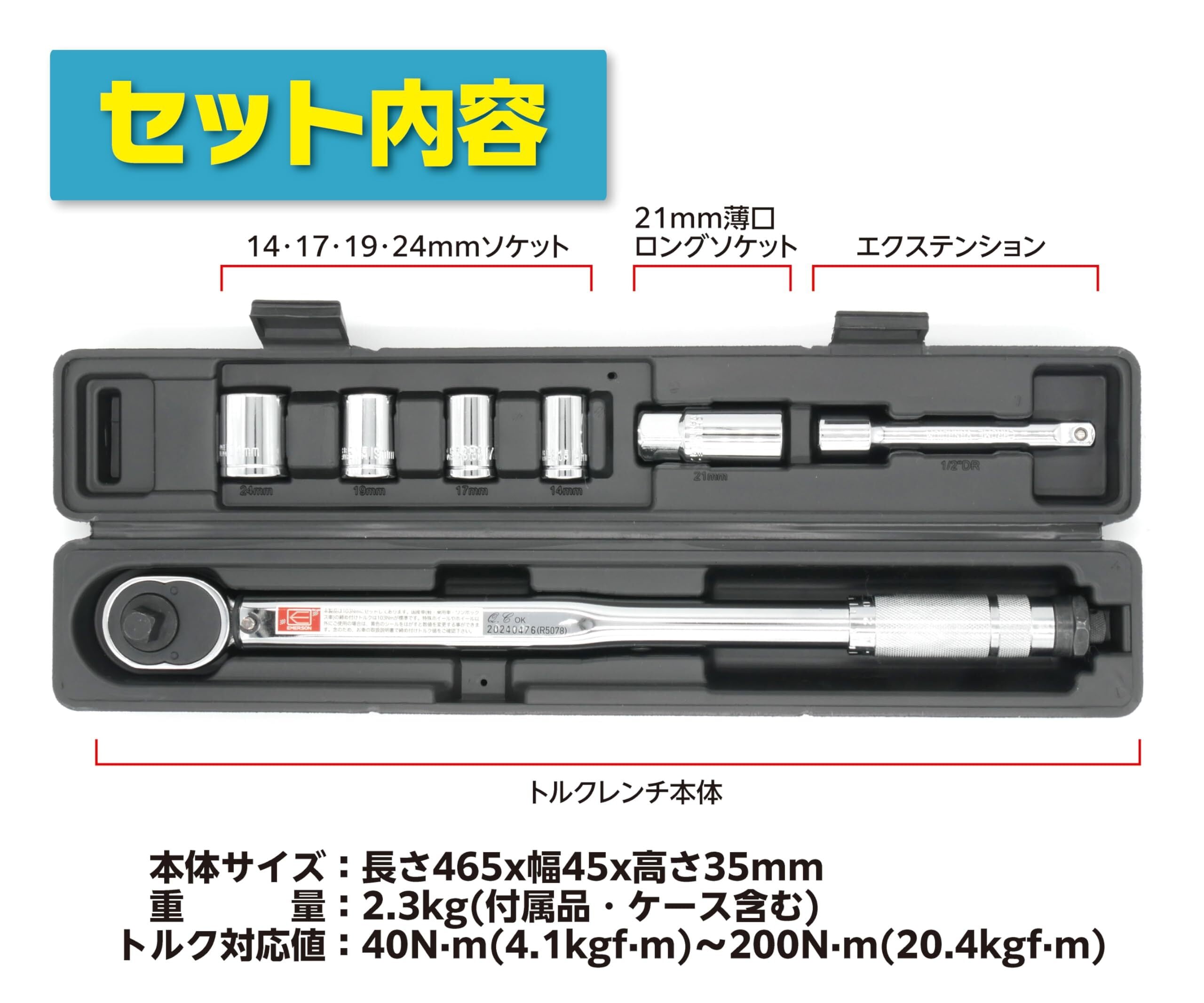 エマーソン(Emerson) トルクレンチ トルク対応レンジ 40〜200N・m トルク精度 ±4% 12.7mm (1/2インチ) 103N・mプリセットタイプ 14/17/19/24mm+21mm薄口ロングソケット、エクステンションバー付属 収納に便利なケース付き EM-29 | KSショップ