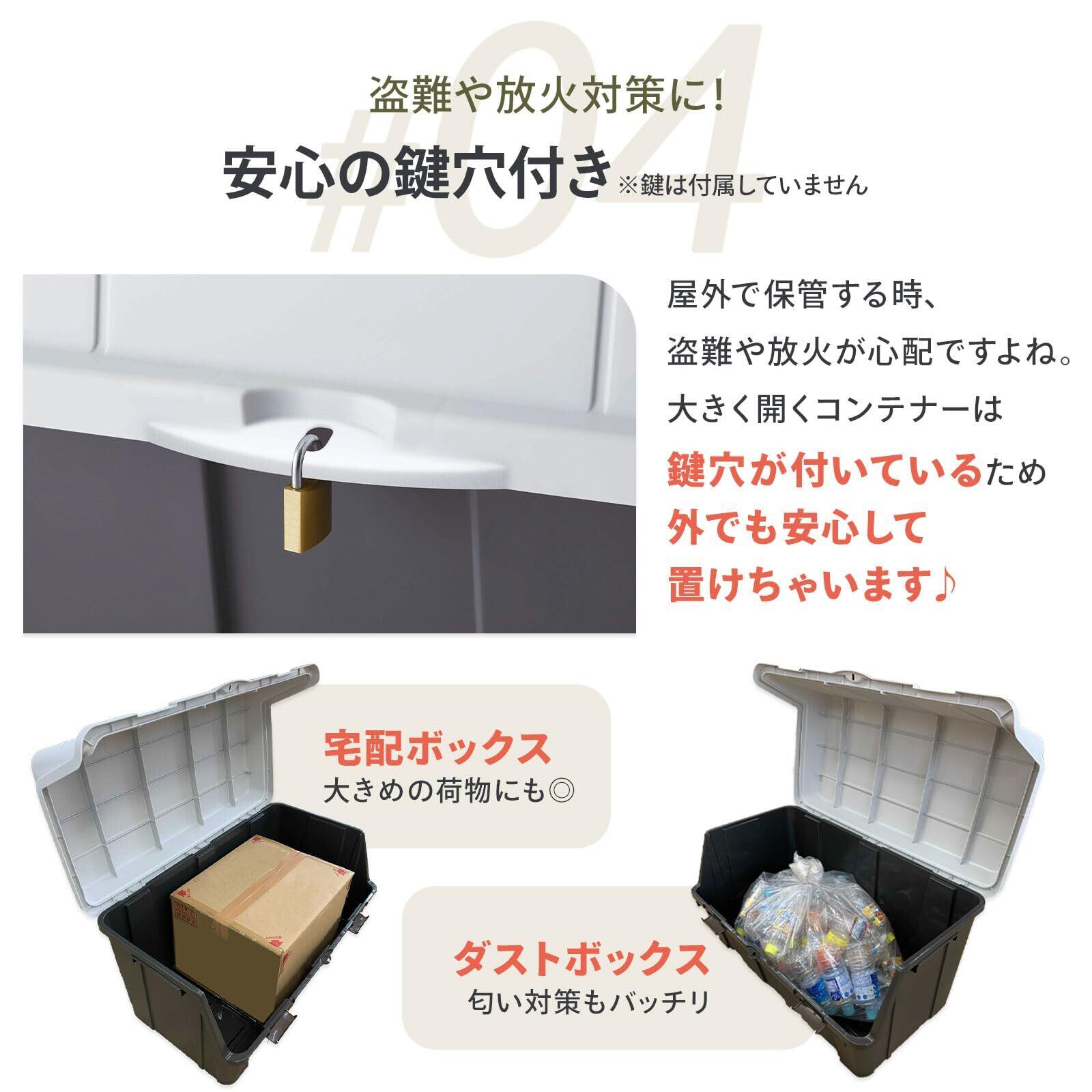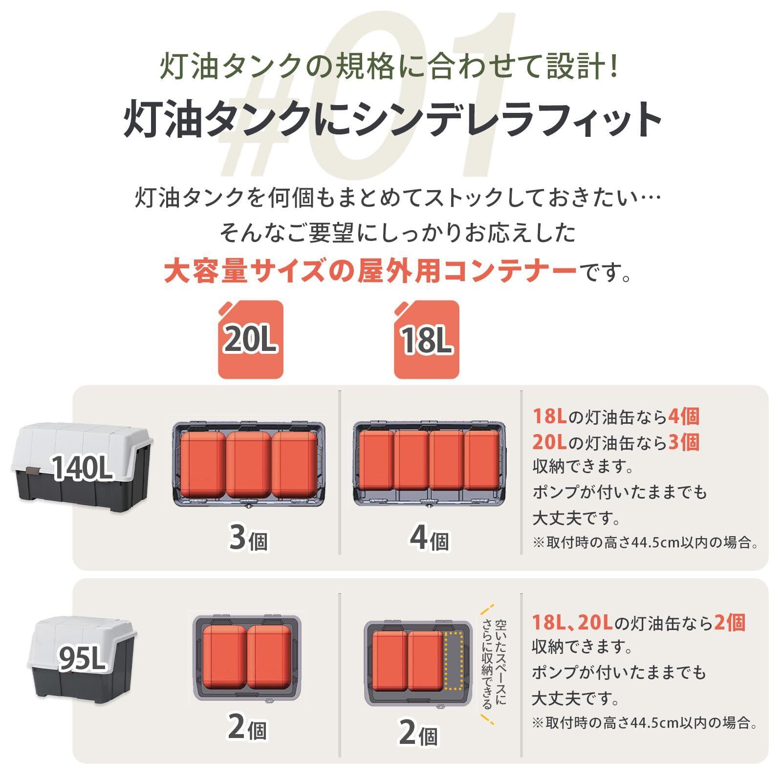 容量140Lのコンテナー(ストッカー)。18Lの灯油缶なら4個、20Lの灯油缶なら3個収納可能。重い物でも取り出しやすく、市販の南京錠が付けられる鍵穴付きで、防犯対策もバッチリです。