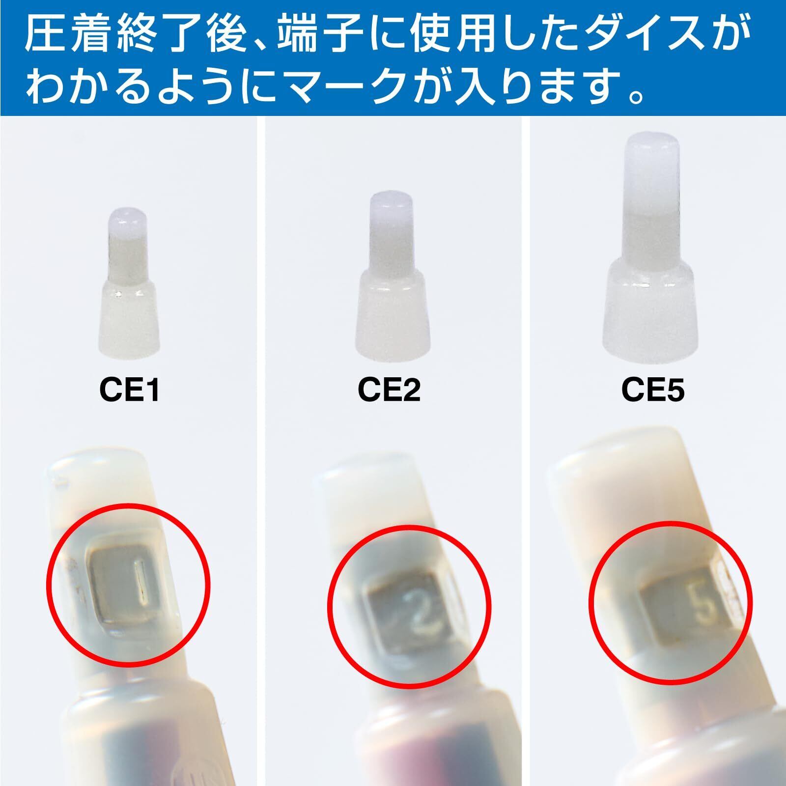 ・圧着終了後、端子に使用したダイスがわかるようにマークが入ります。