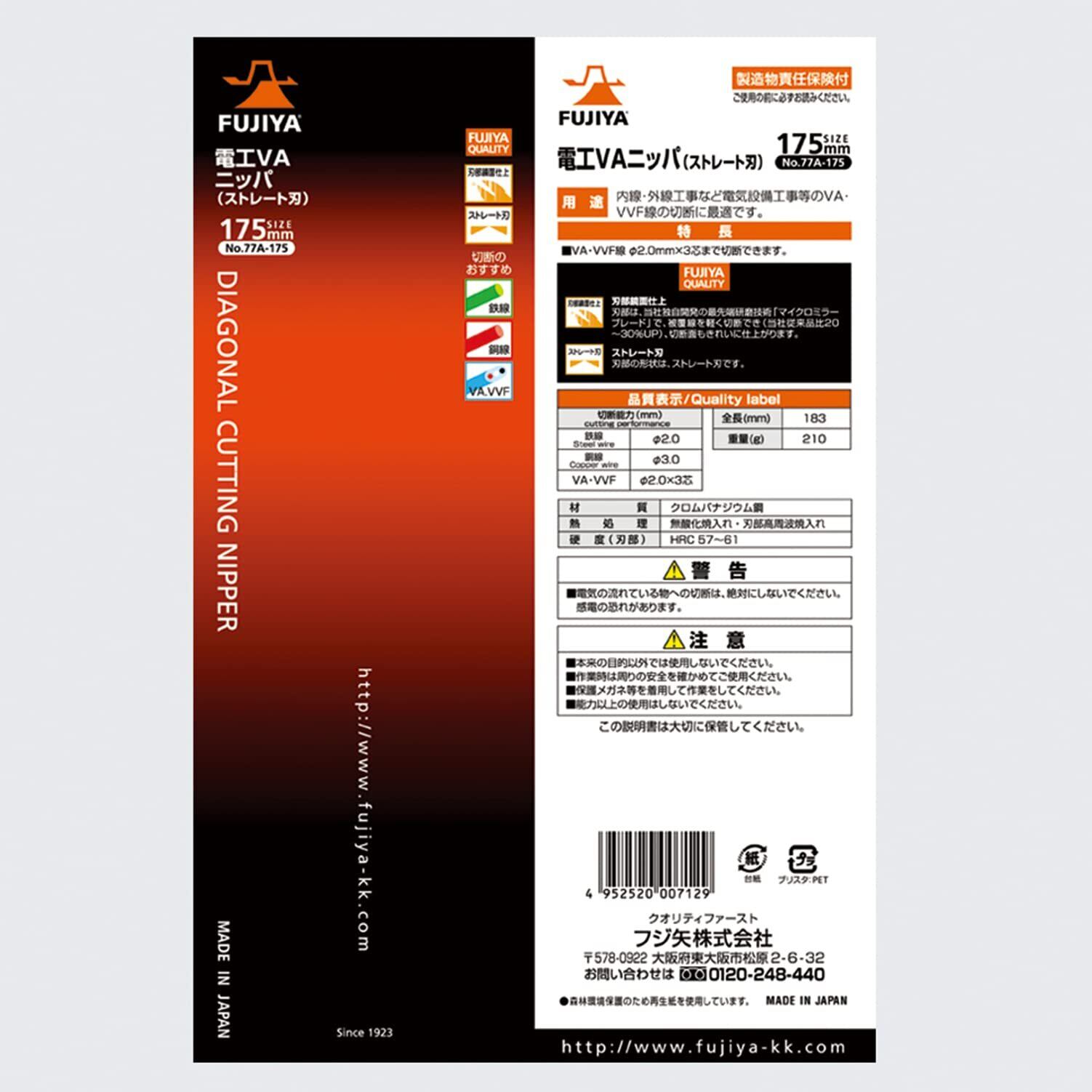 フジ矢(Fujiya) 電工VAニッパ(ストレート刃) 175mm VA線切断に最適な刃部鏡面仕上げ 77A-175