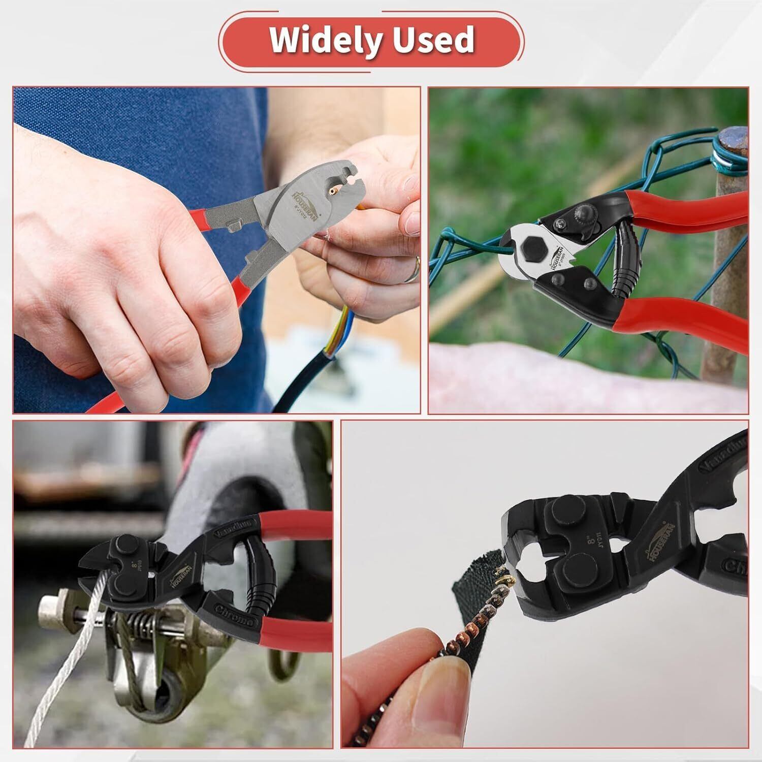 "【切断能力】ボルトカッター(ペンチの一種):HRC≤30の金属を最大5mmまで切断可能。 ケーブルカッター(ケーブル用ペンチ・ニッパ):4/0アルミニウム線、2/0銅線、通信ケーブルを楽に切断します。ワイヤーロープカッター(鋼索用ペンチ・ニッパ):斜めに研がれた口金で5mmまでの鋼索を切断し、繊維のふくらみを防ぎます。エンドカッティングプライヤー(端子切断ペンチ):鋭く角度の付いた口金で、釘、リベット、ワイヤーを表面に密着させて切断します。"