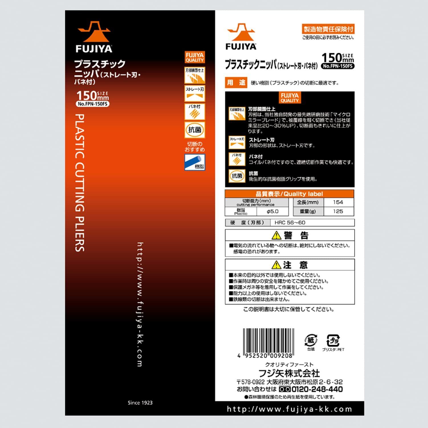 フジ矢(Fujiya) プラスチックニッパ (ストレート刃・バネ付) 150mm 刃部鏡面仕上げ FPN-150FS