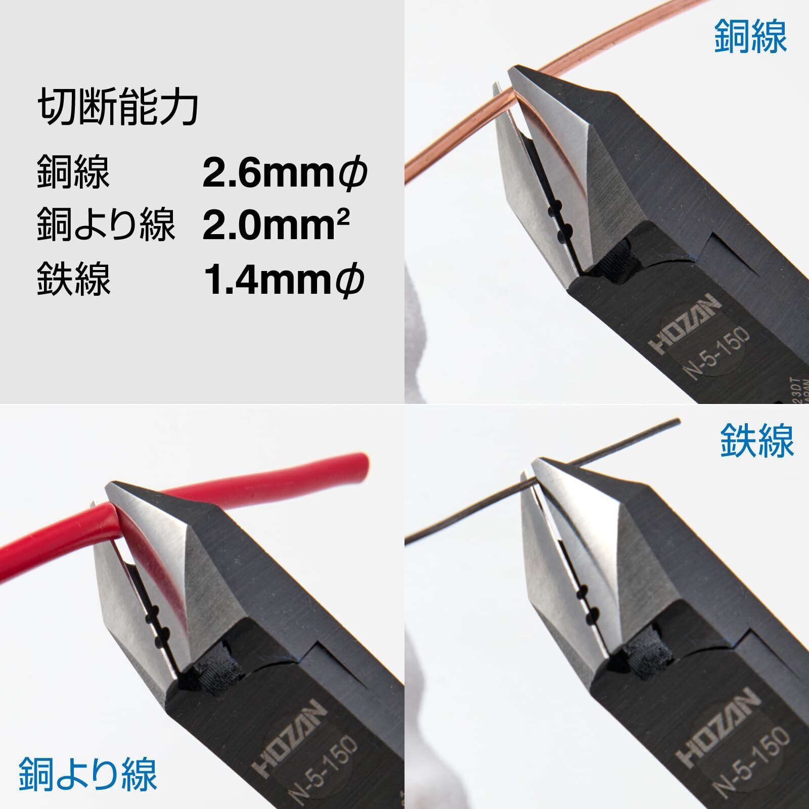 切断能力は銅線2.6mmφ、銅より線2.0mm^2、鉄線1.4mmφ。銅線切断に適した斜ニッパーです。