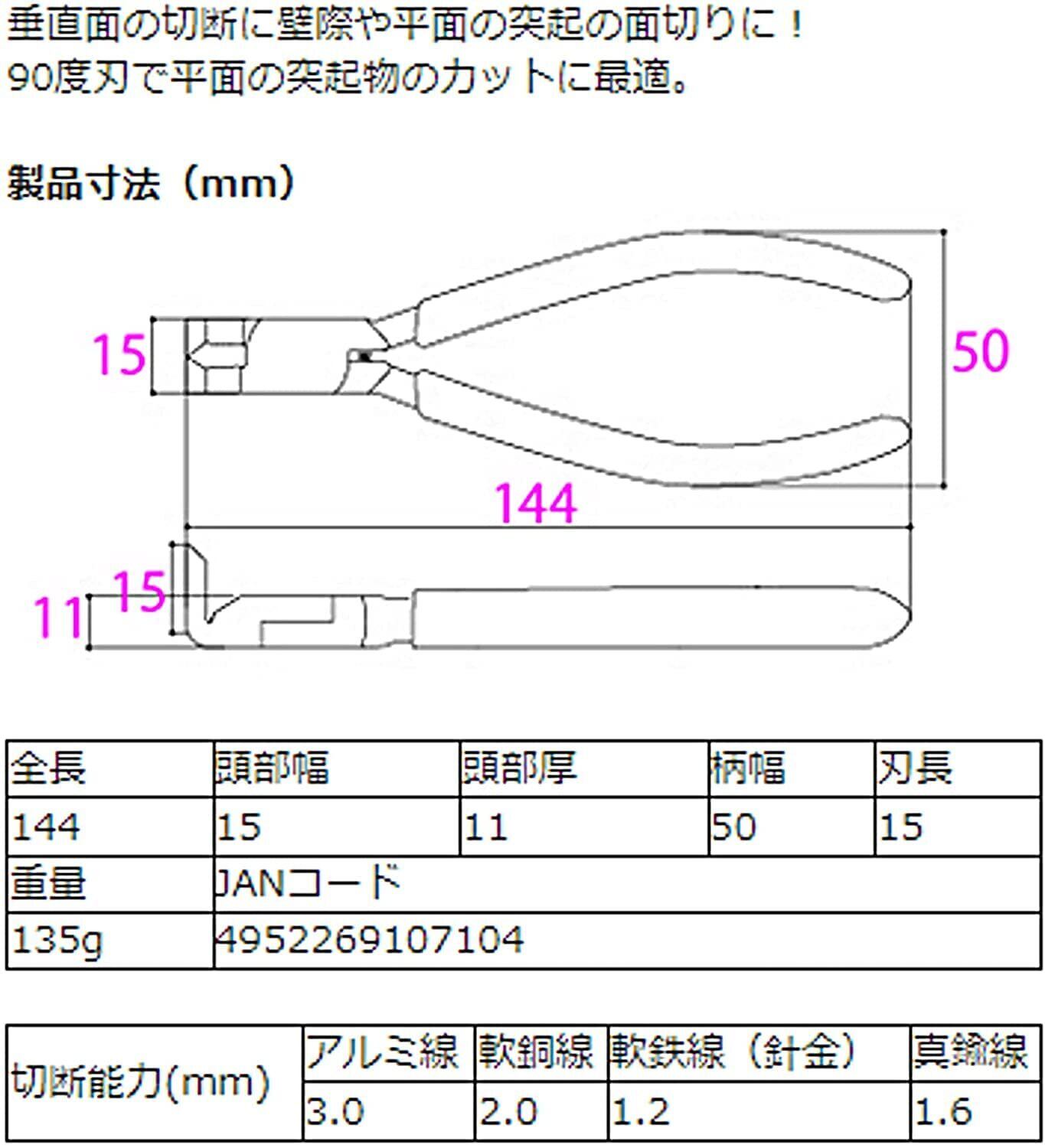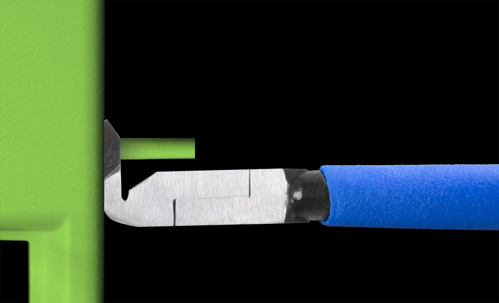 通常のニッパーでは入らない奥まった箇所や狭所作業、障壁を交わしての切断、垂直面の切断、窓際や平面の突起物の面切りに最適な先端が90度に曲がったプラスチックニッパー。フラット刃で切断面のバリが少なくキレイに仕上がります。光造形の3Dプリンターサポート材の除去やABS樹脂の切断にも。