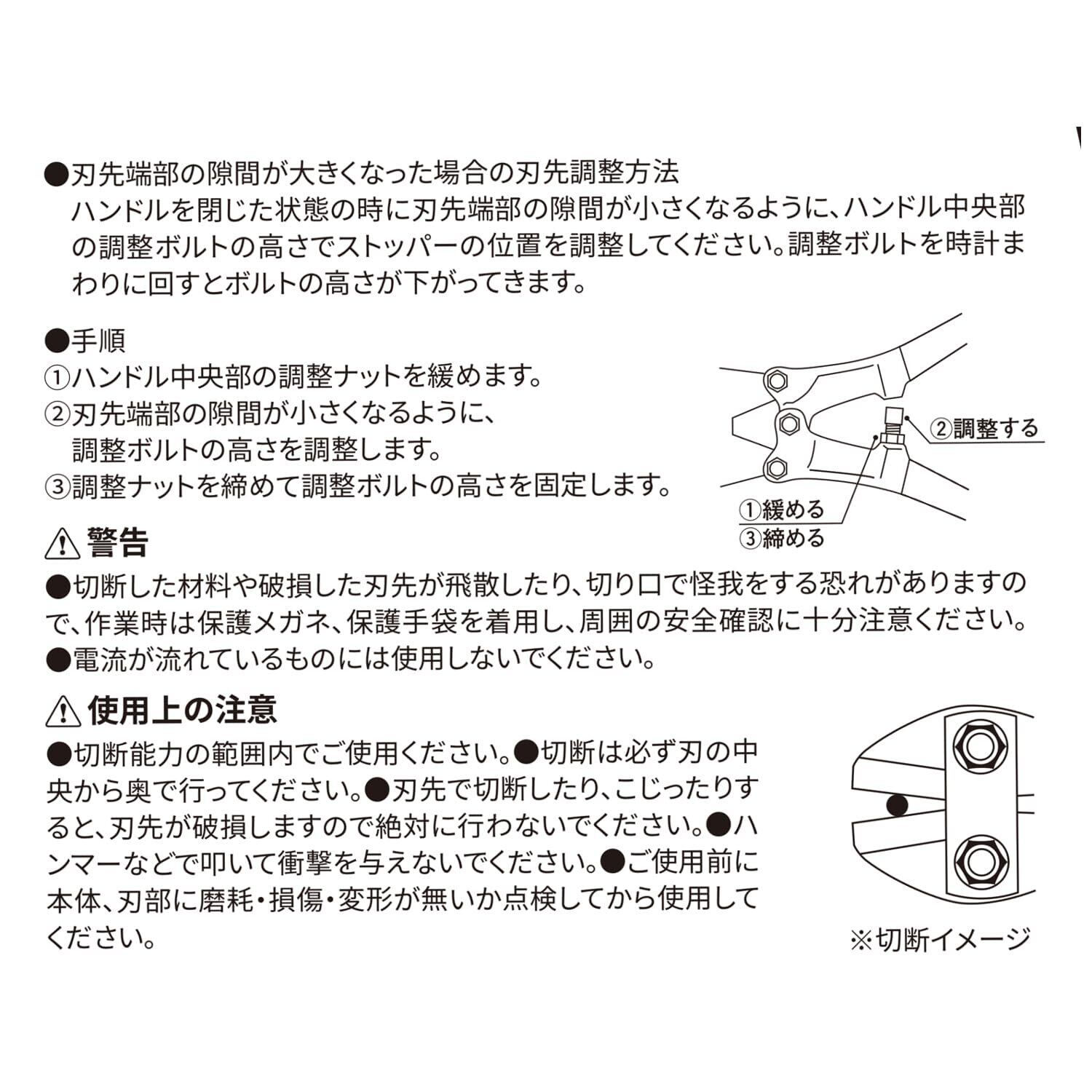 注意:切断は必ず刃の中央から奥で行って下さい。刃先で切断したり、こじたりすると刃先が破損します。