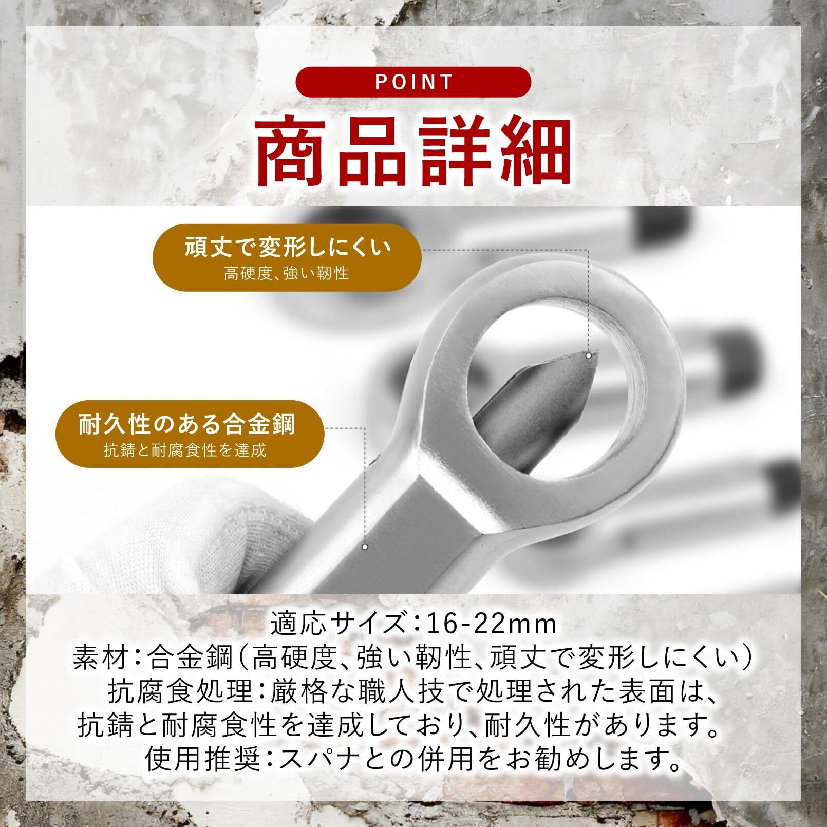【商品詳細】適応サイズ:16-22mm 素材:合金鋼(高硬度、強い靭性、頑丈で変形しにくい) 抗腐食処理:厳格な職人技で処理された表面は、抗錆と耐腐食性を達成しており、耐久性があります。 使用推奨:スパナとの併用をお勧めします。