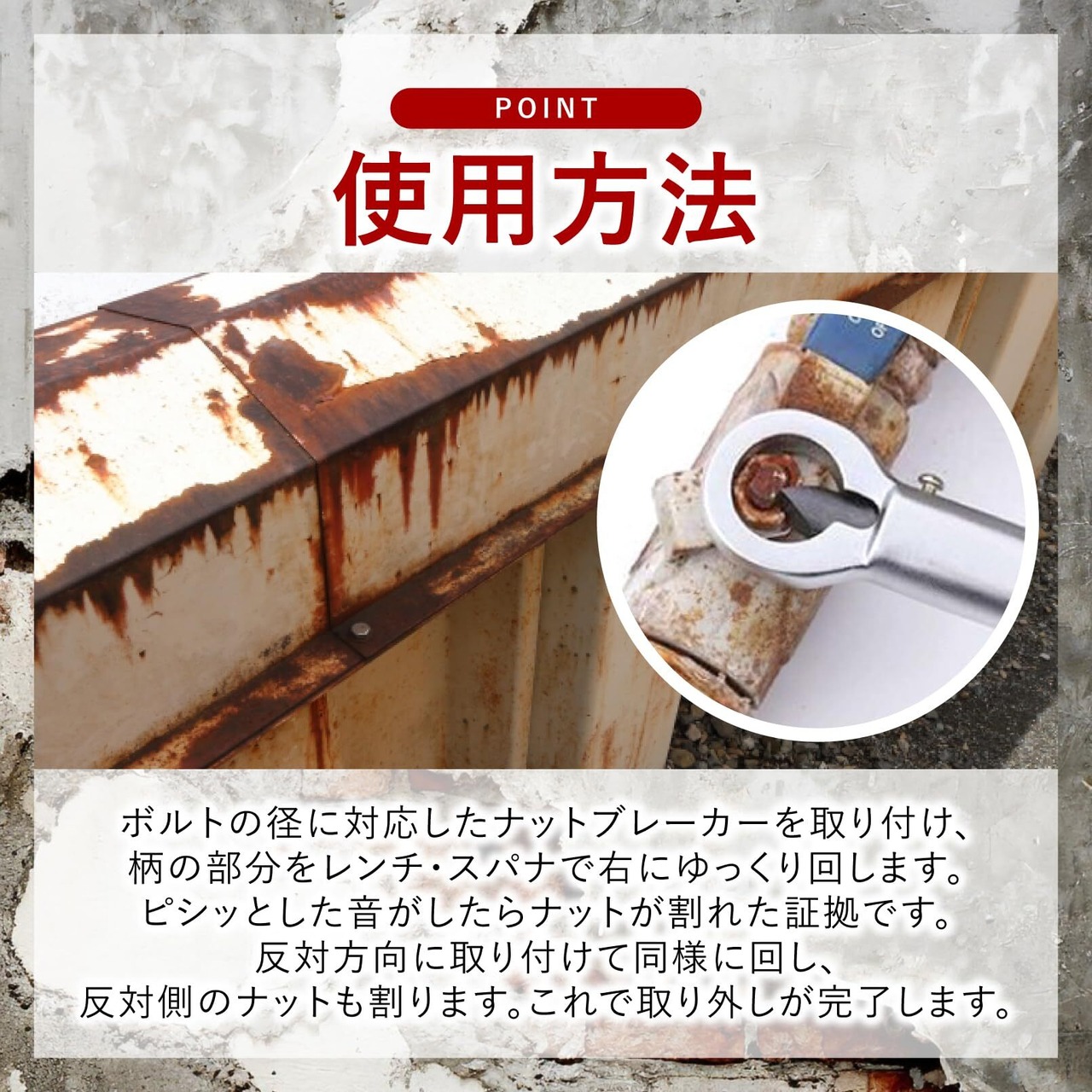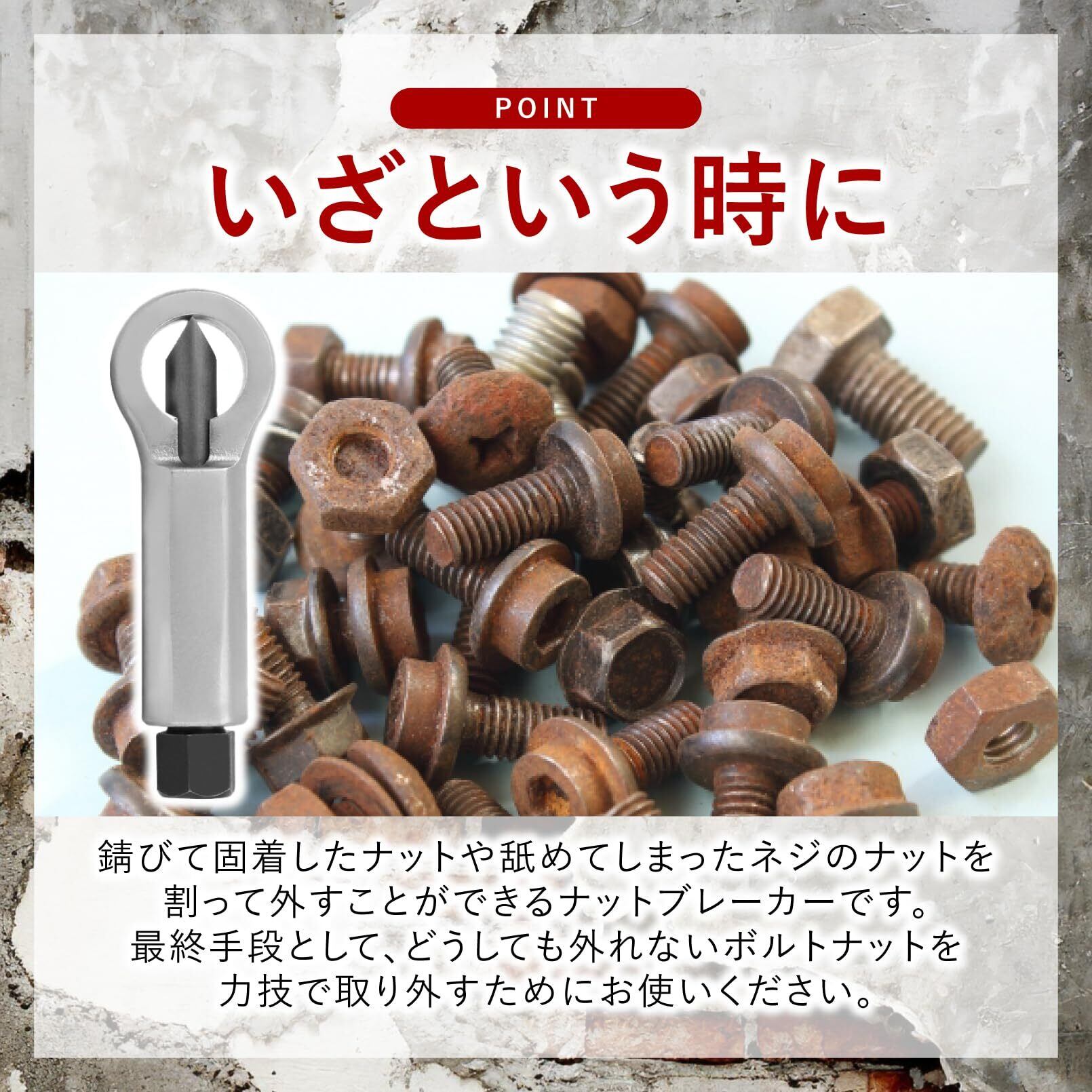【商品概要】錆びて固着したナットや舐めてしまったネジのナットを割って外すことができるナットブレーカーです。最終手段として、どうしても外れないボルトナットを力技で取り外すためにお使いください。