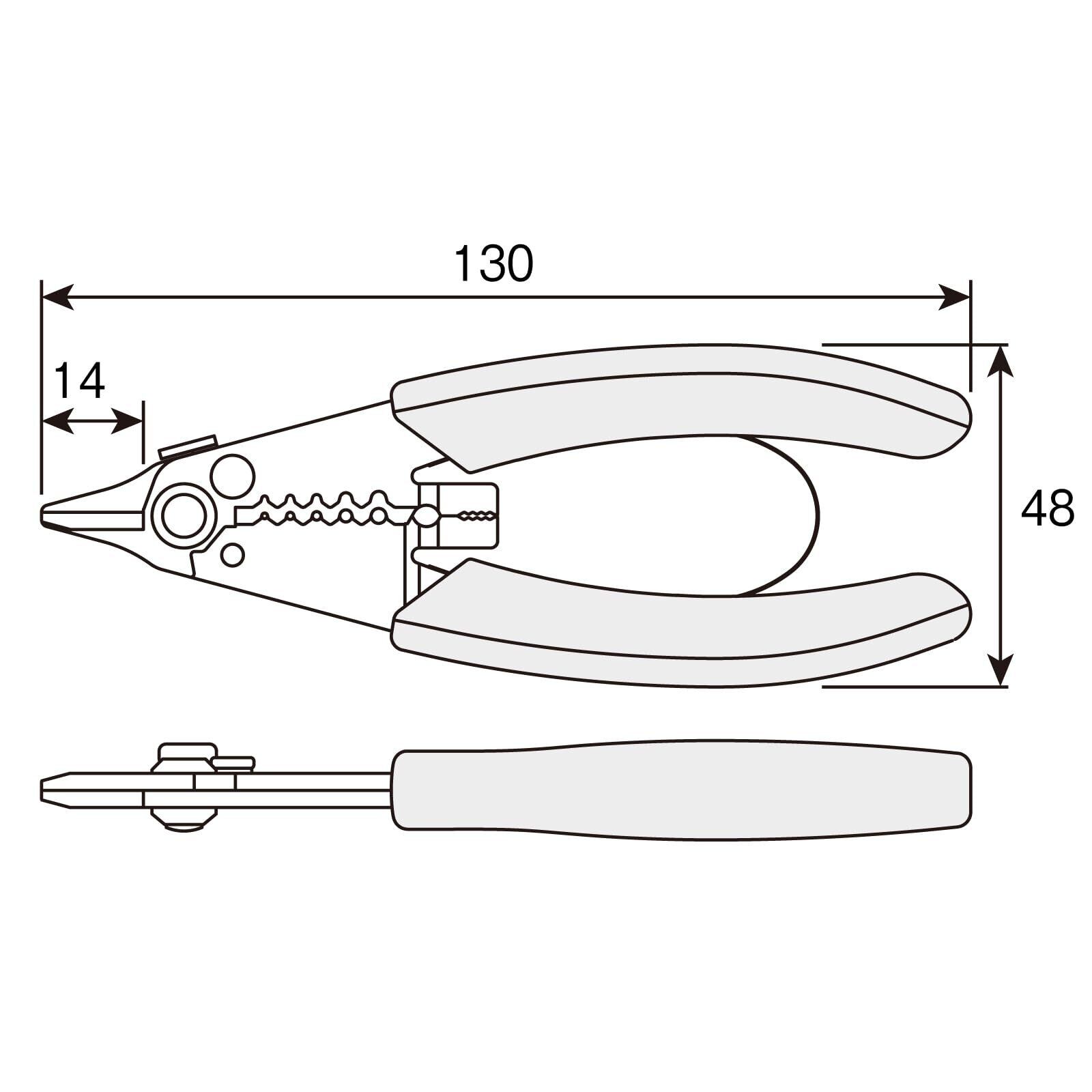 裏面には1mm単位のスケールをマーキング。ストリップ長の測定ができます。また、電線の曲げや引っ張り、被覆の除去に便利なプライヤー、収納時にも安心のストッパー付きです。