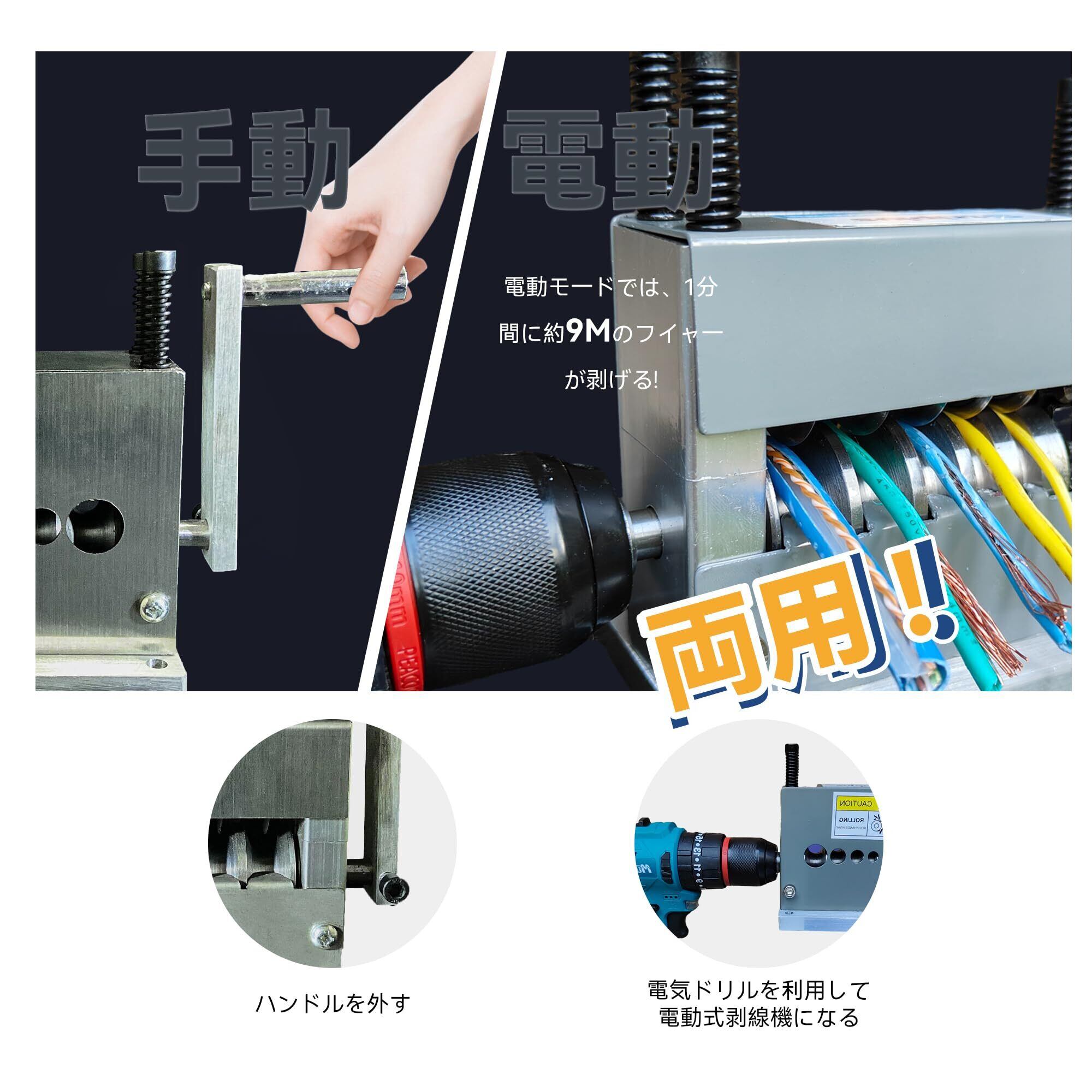 【 高速でスムーズなワイヤーストリップ】手動式ワイヤーストリップ装置のハンドルは取り外し可能で、簡単に使用でき、電気ドリルに接続して電気ワイヤーストリップを行うことができます。