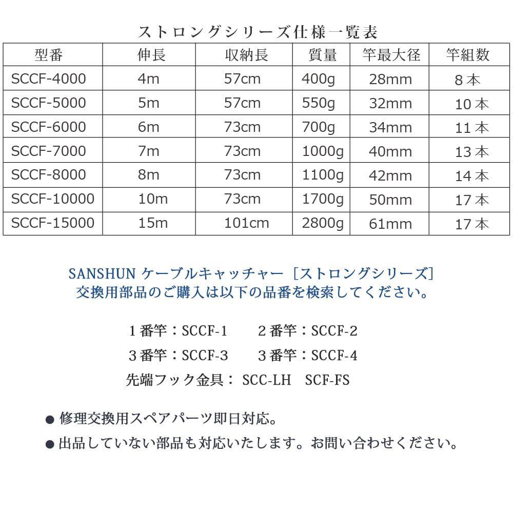 SANSHUN ストロングキャッチャー10M伸長(SCCF-10000)折れない竿作りを目指したタフなケーブルキャッチャー。先端竿Φ12㎜ 、耐重に強い頑丈な竿ボディは強さと粘りを調和した肉厚なカーボン素材製。用途に合わせて選べる 配線キャッチャー ケーブル索引具 通線工具 | KSショップ