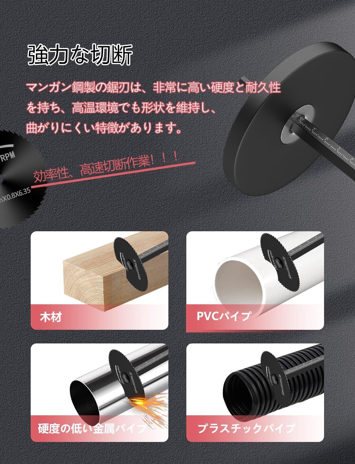 【強力な切断】マンガン鋼製の鋸刃は、非常に高い硬度と耐久性を持ち、高温環境でも形状を維持し、曲がりにくい特徴があります。PVCパイプに加え、木材、プラスチック、薄板、銅板、アルミ板などの素材にも対応でき、工具の寿命を延ばします。