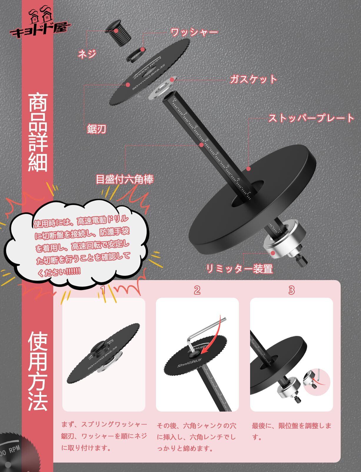 【安全な操作】まず、スプリングワッシャー、鋸刃、ワッシャーを順にネジに取り付けます。その後、六角シャンクの穴に挿入し、六角レンチでしっかりと締めます。最後に、限位盤を調整します。使用時には、高速電動ドリルに切断盤を接続し、防護手袋を着用し、高速回転で安定した切断を行うことを確認してください(必ず人身の安全を最優先してください)。