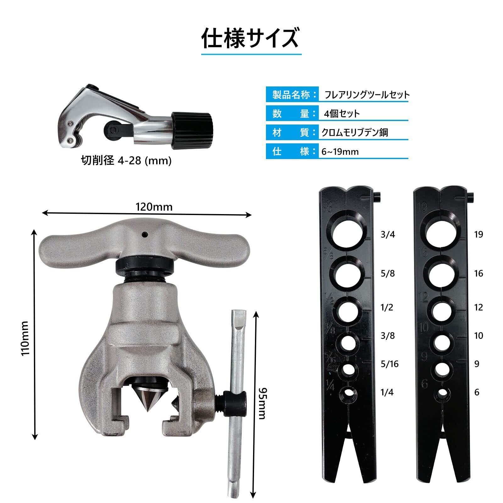 【利用可能なサイズ】:フレアツール用の12つのダイスサイズ。1/4"、5/16"、3/8"、1/2"、5/8"、3/4"と6,9,10,12,16,19のサイズです。