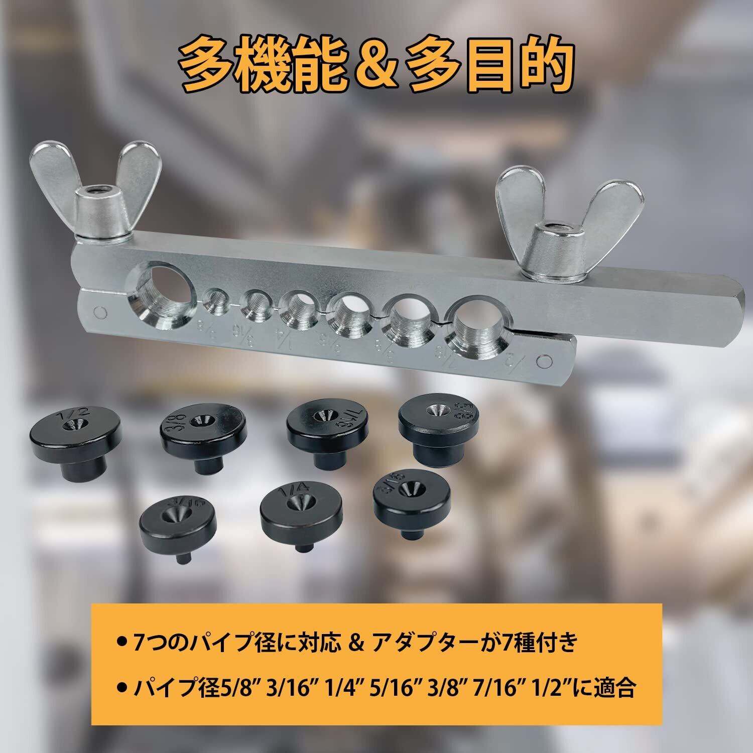【仕様】適用パイプ径:5/8、1/2、7/16、3/8、5/16、1/4、3/16(インチ) フレア角度:45度 適用材質:銅、アルミなど軟質金属