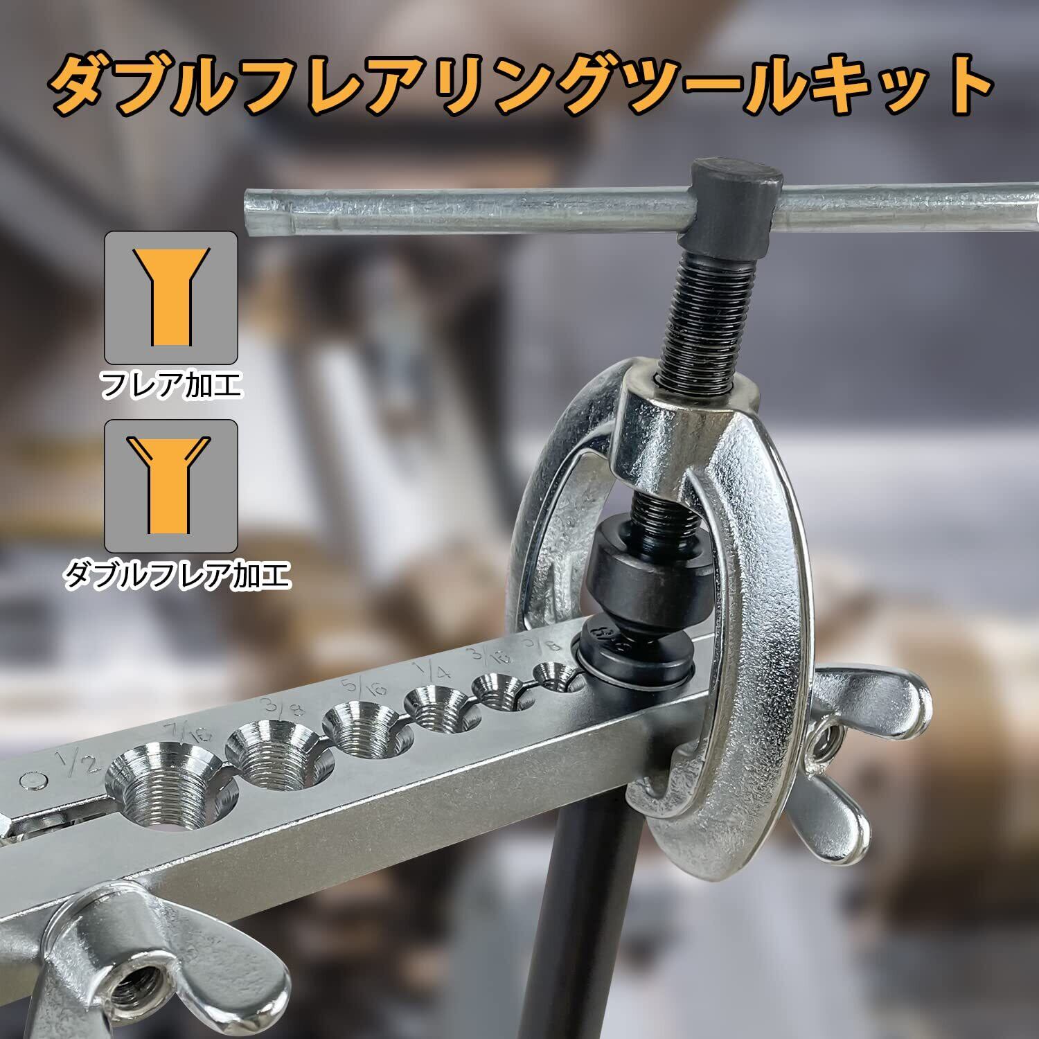 【セット内容】フレアリングツール*1 クランプ*1 チュービングカッター*1 ダブルフレア用アダプター:5/8、1/2、7/16、3/8、5/16、1/4、3/16(各1個) 専用ケース*1