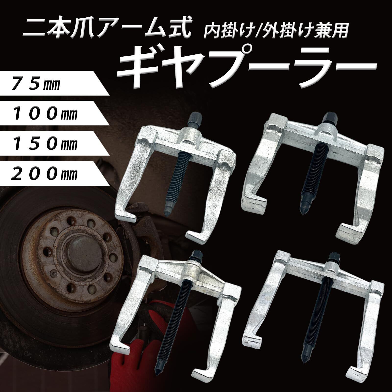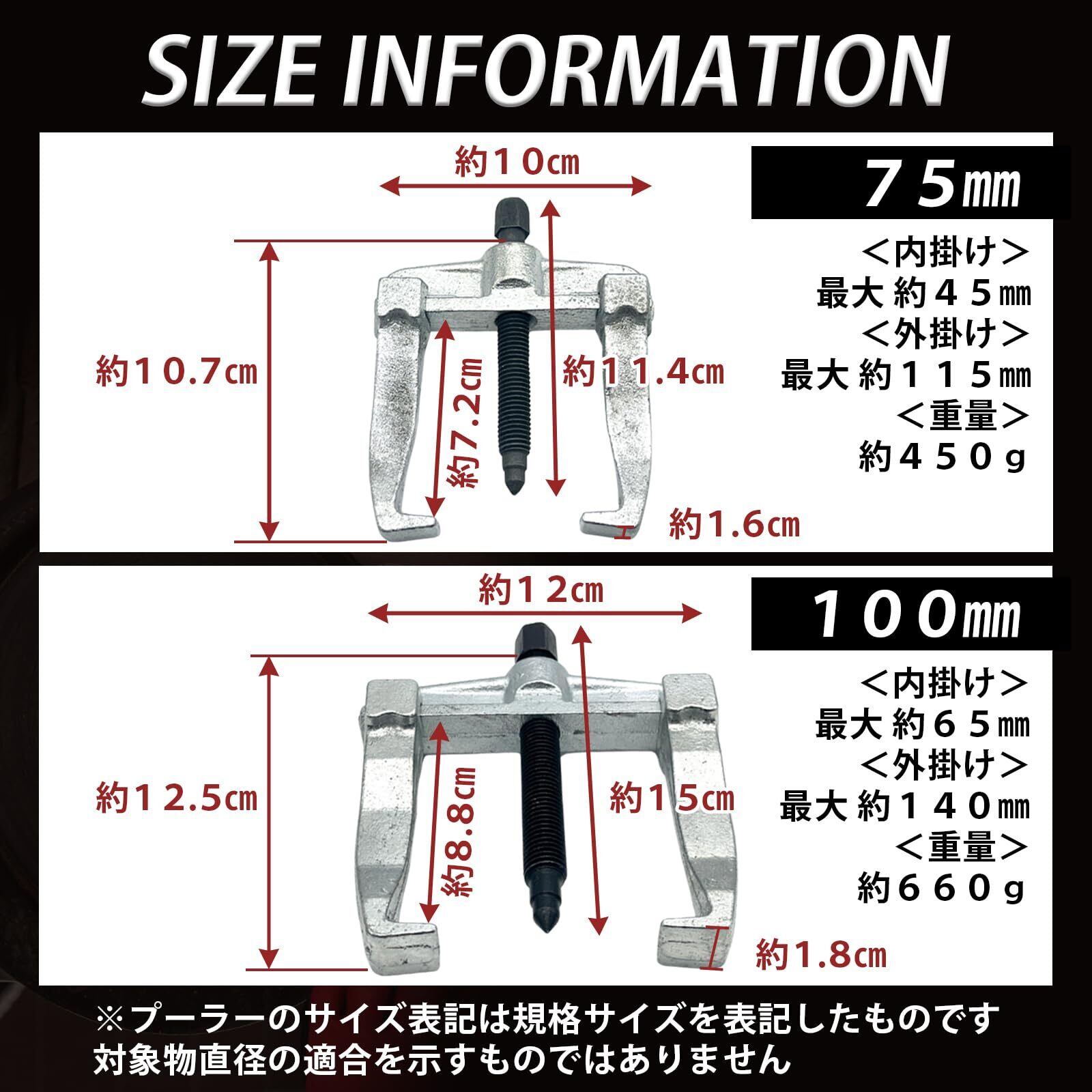 【100mm】内掛け(約):最大 65mm、外掛け(約):最大 140mm、重量(約):660g / 【75mm】内掛け(約):最大 45mm、外掛け(約):最大 115mm、重量(約):450g ※プーラーのサイズ表記は規格サイズを表記したものです。対象物直径の適合を示すものではありません。