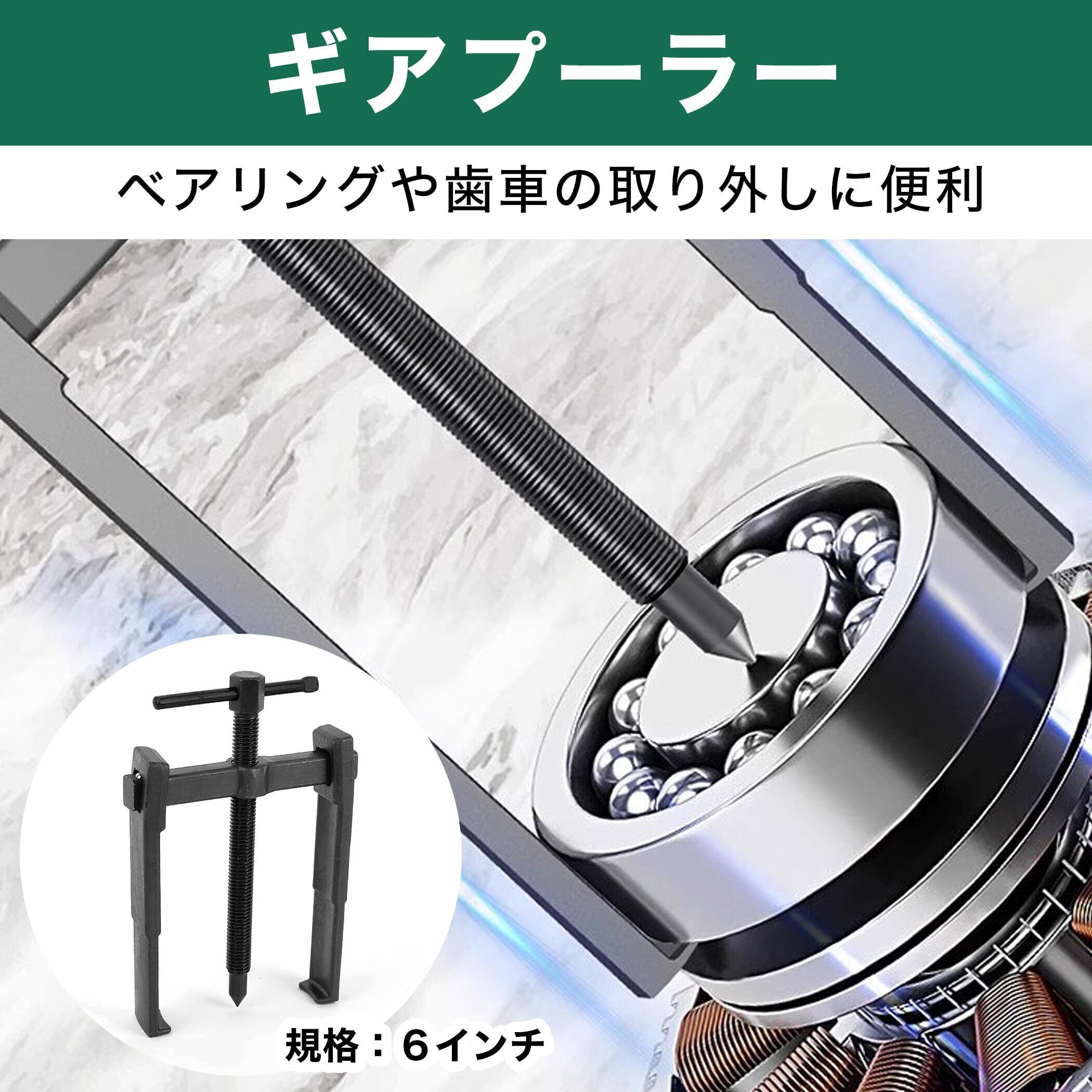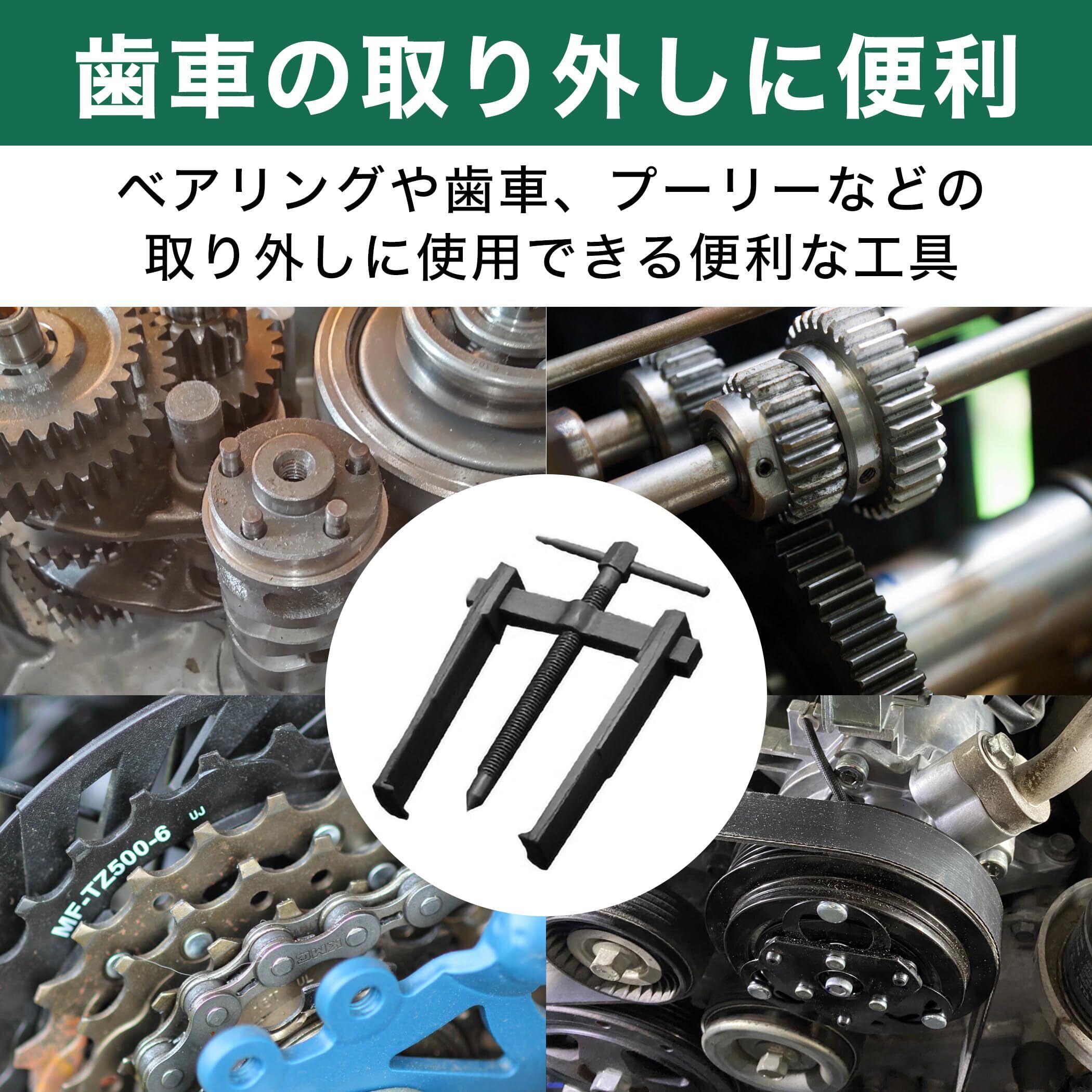ベアリングや歯車の取り外しに便利なプーラー:ベアリングや歯車、プーリー、スプロケットなどの取り外しに使用する工具です。自動車、バイク、機械などのメンテナンスで、ぴったりとはまって取れにくいベアリングや錆びた歯車などを取り外す際にお使いいただけます。