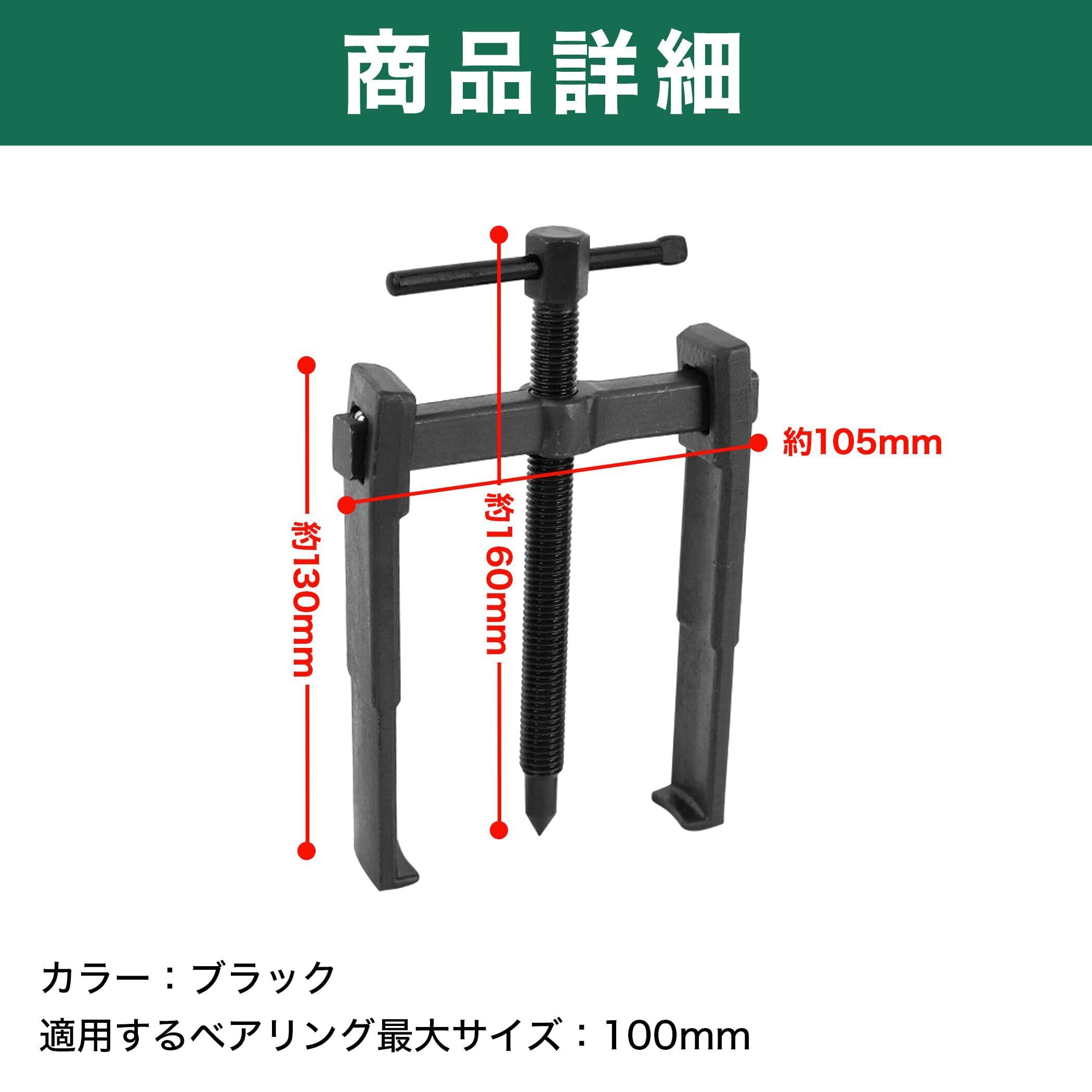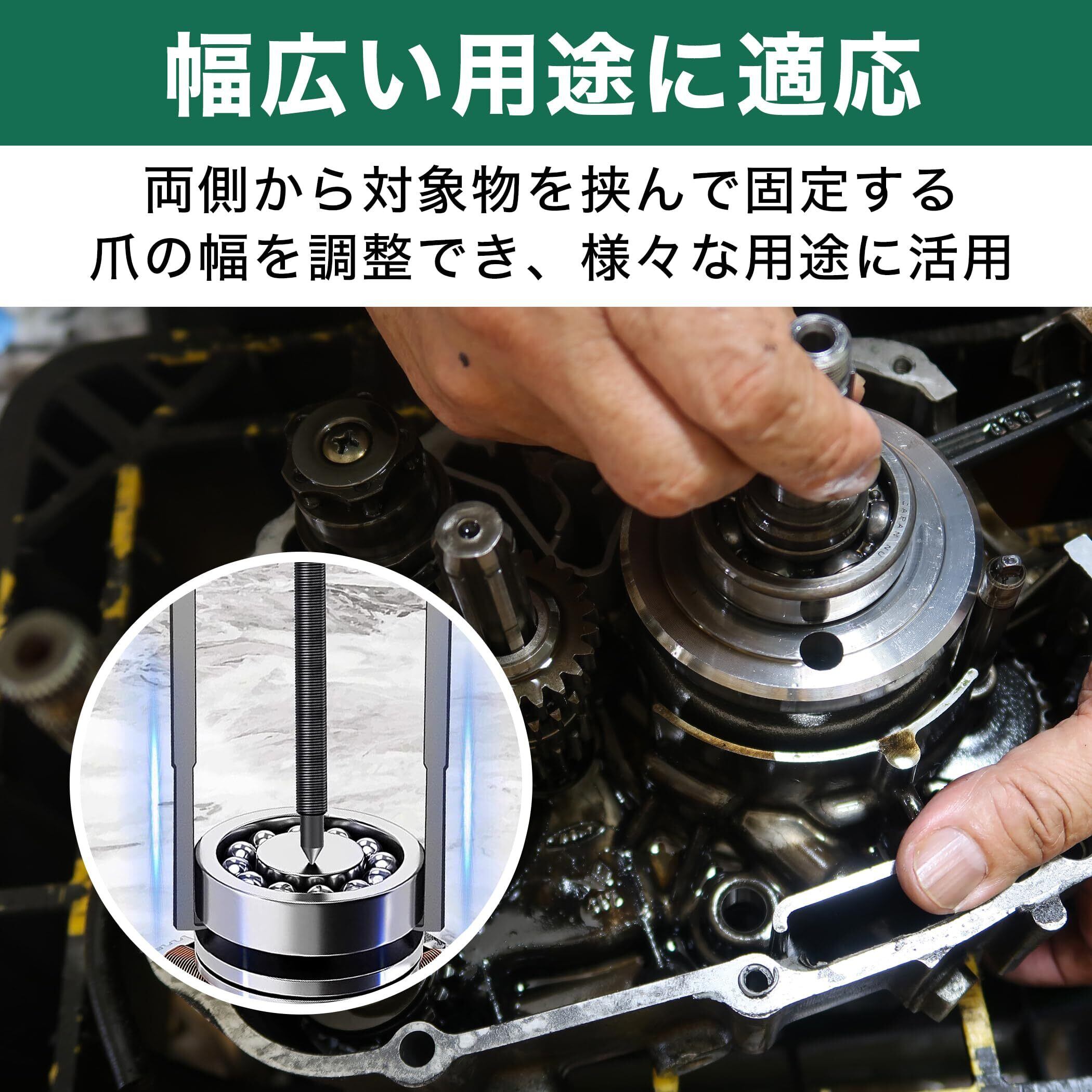爪の幅を調整できるので幅広い用途に適応:こちらのプーラーは二爪タイプで、両側から対象物を挟んで固定します。爪の幅を左右にスライドすることで幅の調整が可能ですので、さまざまなシチュエーションにお使いいただけます。作業中に爪が抜けないようにストッパーもついています。
