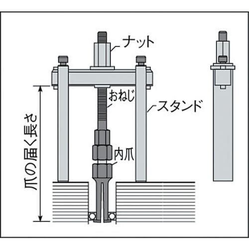 ●ベアリングの内輪引き抜き専用工具です。●内爪をベアリング内径にチャッキングし、スタンドにセットします。あとはナットを回すとベアリングが抜き取れます。●爪の届く長さは最大150mmです。