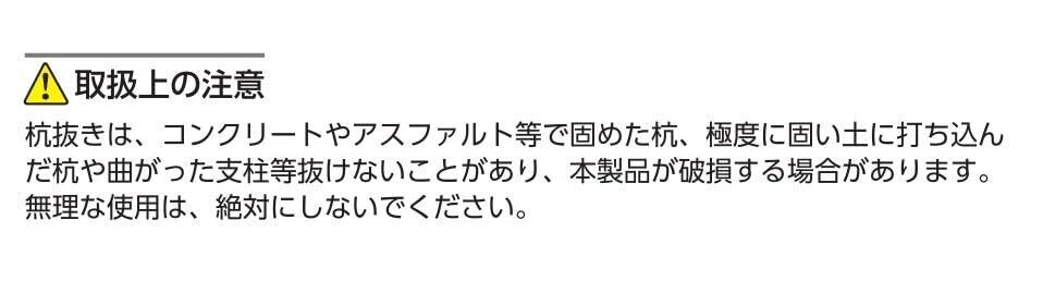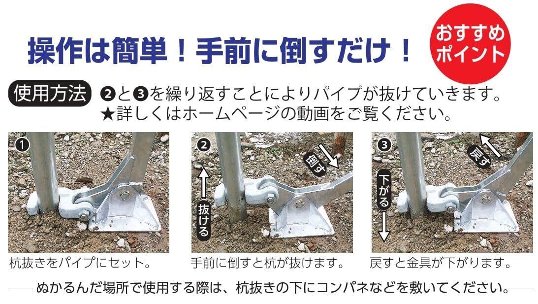 力を入れずにラクラク作業、打ち込みパイプが簡単に抜けます。手・肩・腰への負担を軽減。1人の力でラクに抜けるので重機に頼る必要がなく、狭い現場に持ち込んで使用できるのでとても便利です。●表面処理:溶融亜鉛メッキ ●力点荷重:80kg以内(グリップカバー部)