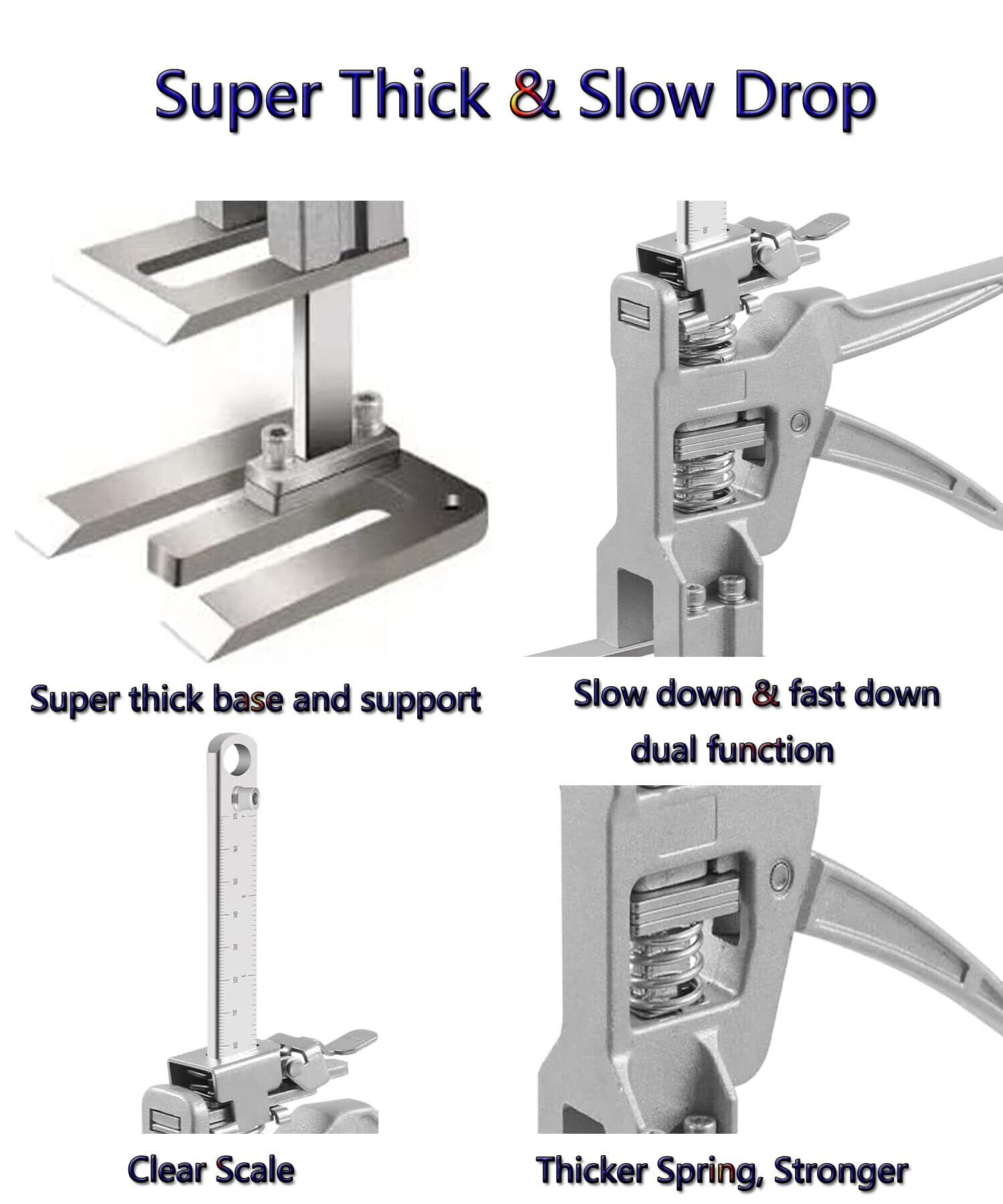 高品質の厚みのある固体鋼素材:アップグレードされたリフティングツール、厚さ0.17インチまでの厚みのある固体鋼ベース、厚みのあるリフティングロッド、より強力なリフティング能力、厚みのあるステンレス鋼のウェーブ高強度スプリング、より長い耐用年数。 ハンドルの幅を広げたデザインにより、力がかかる面積が増え、より快適に使用できます。