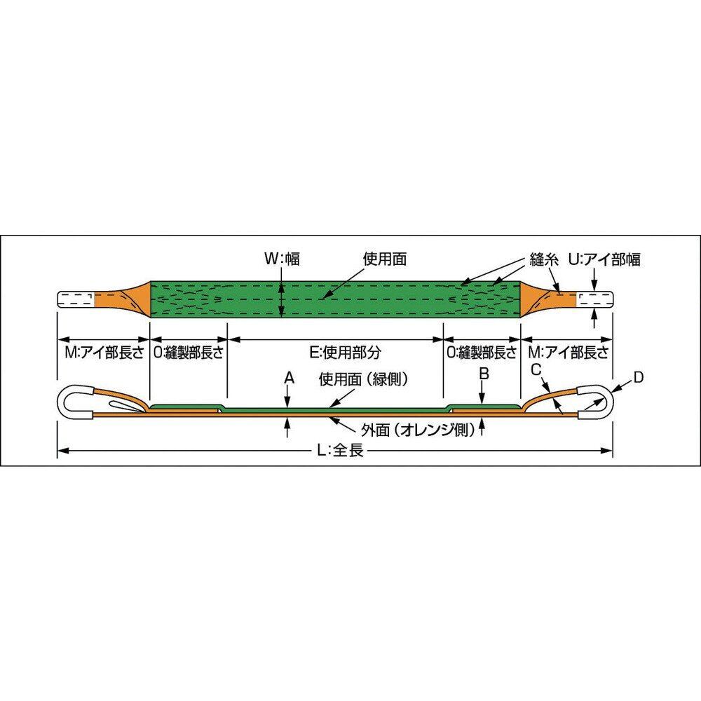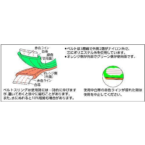 ●JIS B 8818規格品●使用温度:100℃以下●両端アイ形●鋼材:メッキ・塗装などの表面加工鋼材・鋼管・鋼板などの運搬。●機械:自動車および自動車部品・精密機械の運搬。●適度な伸びが衝撃を柔らげます。●グリーン面(使用面)とオレンジ面(外面)が色分けされています。(ベルトスリングの構造上、グリーン面(使用面)とオレンジ面(外面)では耐久性が異なりますので、グリーン面(使用面)で正しく使用してください。)