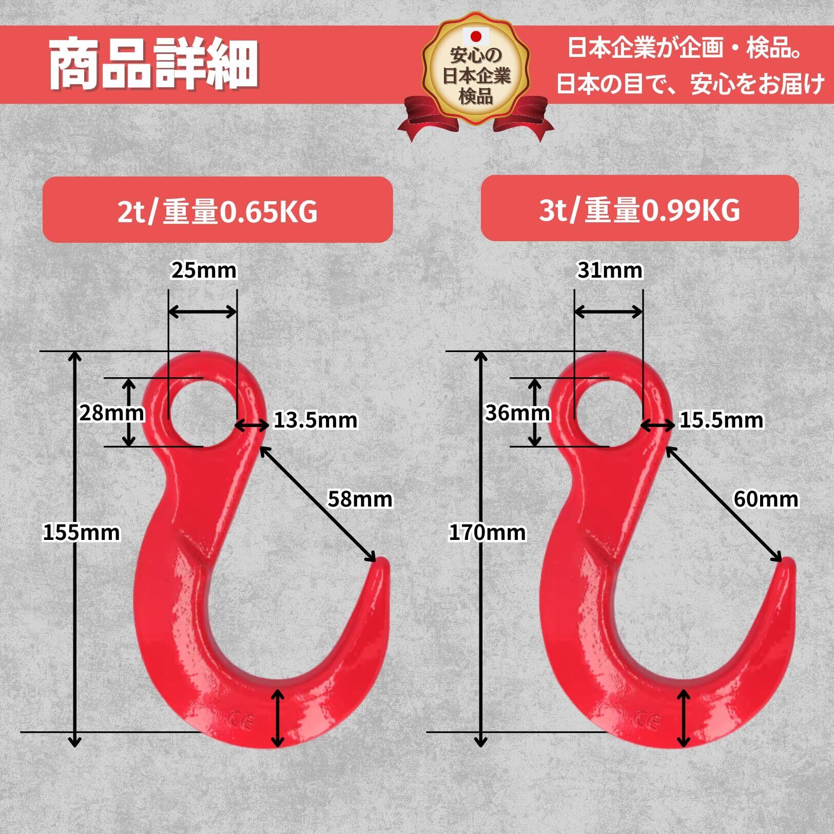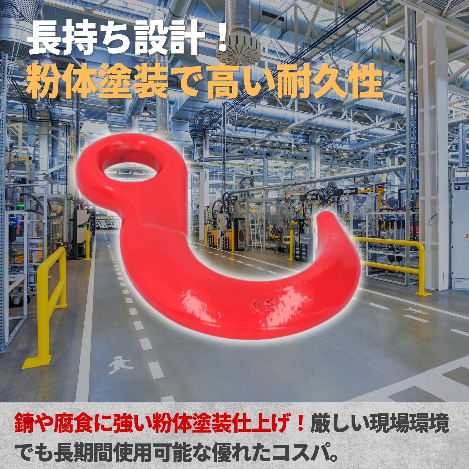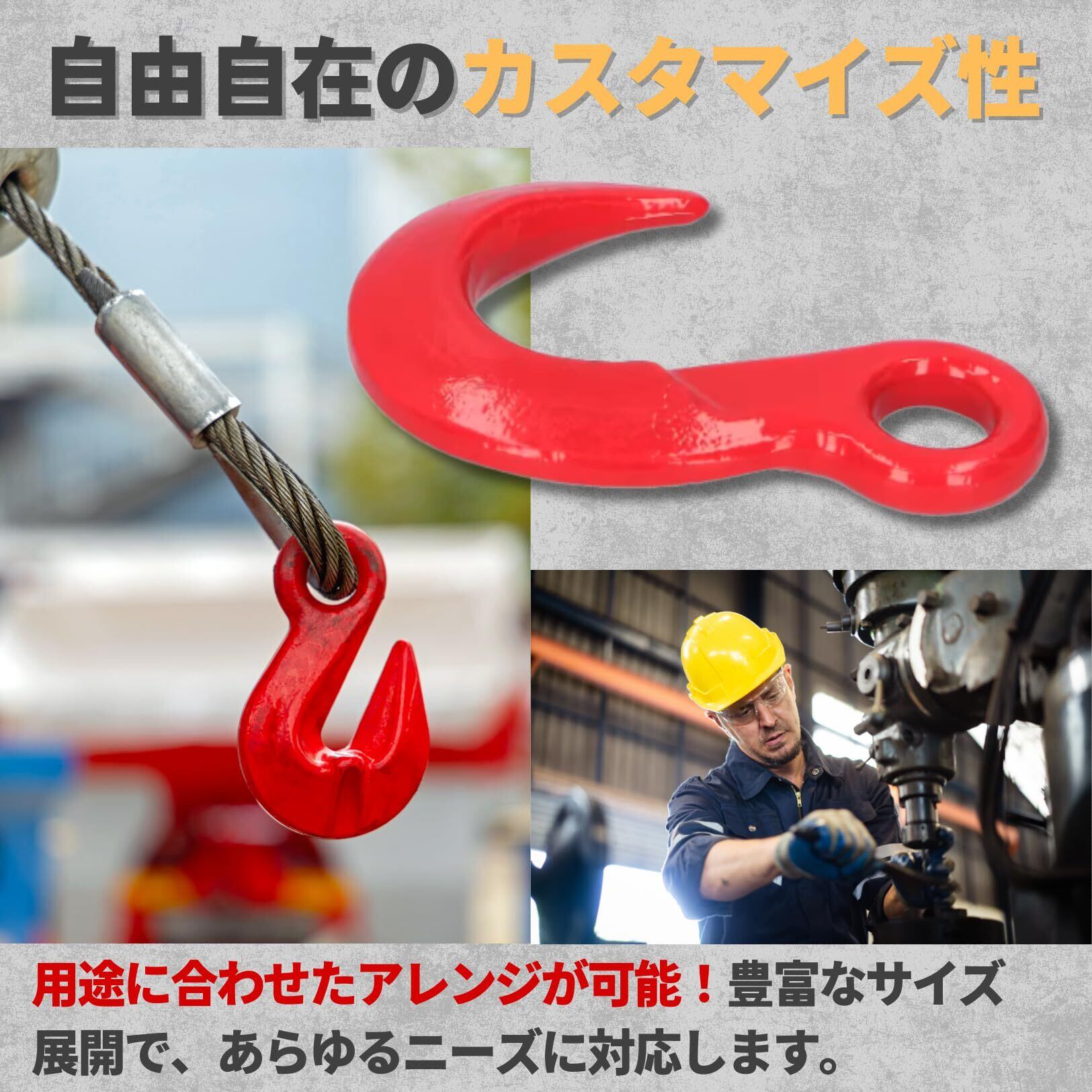 【カスタマイズ性と用途の広さ】 用途に応じて自由にカスタムできる仕様が魅力。ワイヤーロープやチェーンの先端吊り具として、建設現場や物流現場で幅広く活用されています。サイズも豊富なので、ニーズにぴったりの一品が見つかります。
