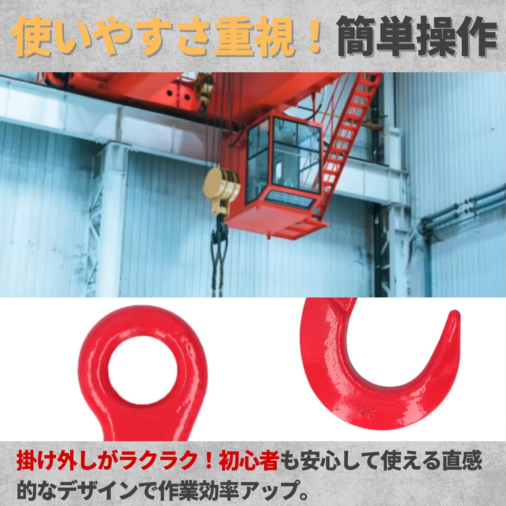 【安心設計】 掛け外しがスムーズで安全性も抜群。玉掛け作業や吊り下げ作業を効率化し、手間を大幅に削減します。操作が簡単なため、初心者から熟練者まで幅広いユーザーに適しています。